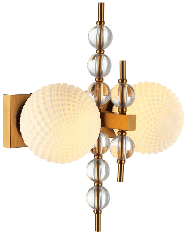 Светильник настенный из коллекции Queenly выполнен из металла, гальванизированного в цвет бронзы, и декорирован сферами из прозрачного стекла и плафонами из глянцевого фактурного стекла белого цвета. Светильник настенный коллекции выглядит стильно и респектабельно. Премиальное качество и неповторимыи? дизаи?н светильников идеально подои?дут в современные и дизайнерские интерьеры.