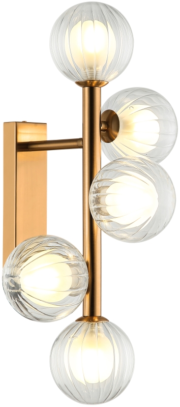 Светильник настенный из коллекции Shardin выполнен из металла, гальванизированного в цвет бронзы, и декорирован двойными плафонами из прозрачного внешнего стекла с линейным рисунком и внутреннего белого матового.