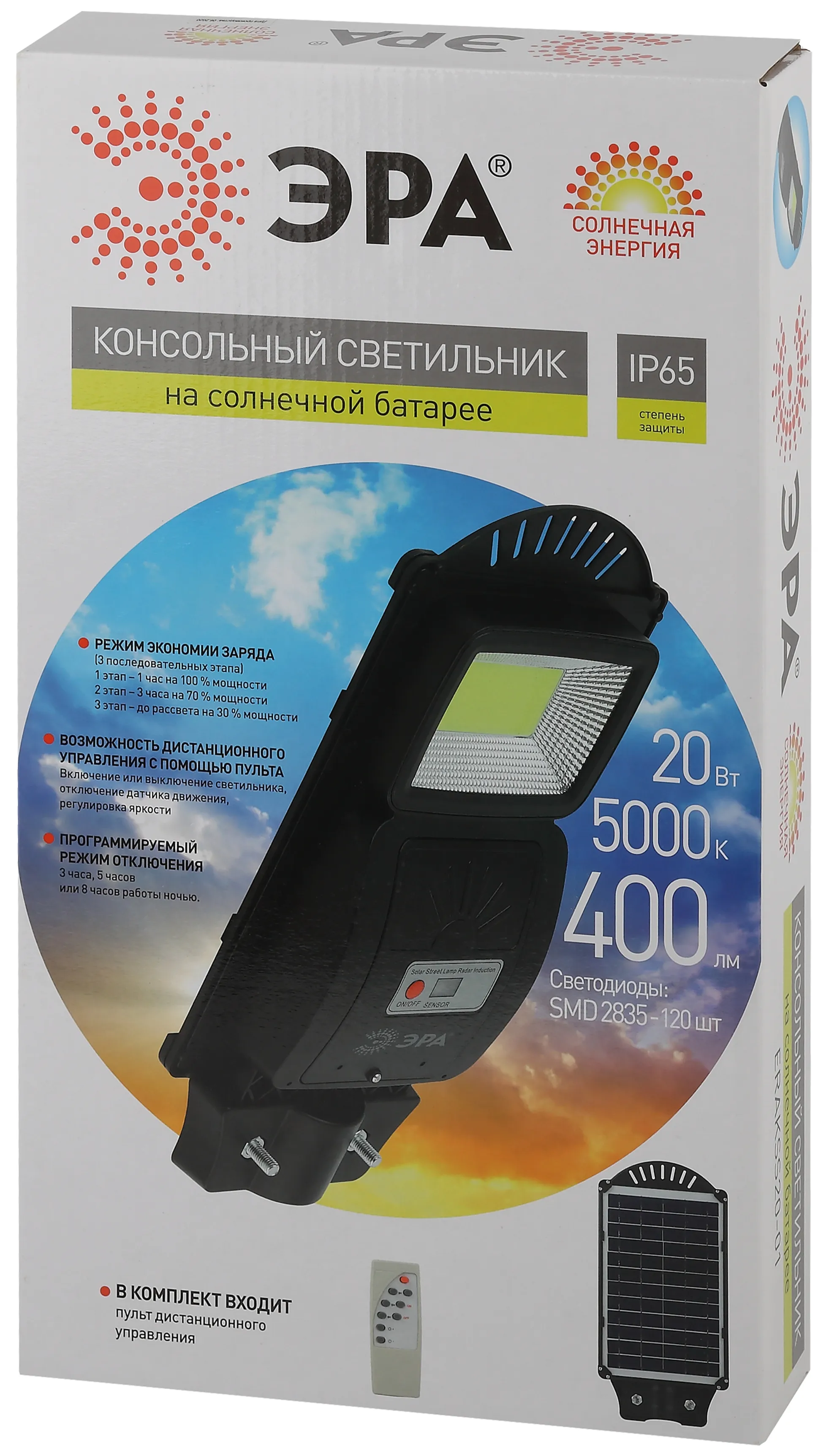 Консольные уличные LED-светильники ЭРА на солнечных батареях эффективно работают круглый год. Солнечная батарея встроена в корпус и занимает всю внешнюю часть плафона. На внутренней части размещены светодиодные платы (одна или несколько - в звисимости от модели) с яркими и экономичными LED-элементами COB последнего поколения и широкими светоотражателями. Имеют авторежим, позволяющий с успехом экономить заряд. В течение первого часа после включения светят со 100% яркостью, следующие 3 часа - с 70% яркостью и далее до рассвета - с 30% яркостью. Так мы получаем максимально яркий свет в нужное время (вечером, сразу после захода солнца) и гарантию того, что дополнительного освещения хватит до самого утра. Ещё одно важное преимущество для экономии заряда - в светильники встроен датчик движения. Освещение будет включено только в тот период, когда рядом со светильником находятся люди. Это значит, что светильники не будут работать ночью "зря". Обе эти функции - и авторежим, и датчик движения - можно отключать, если для вас они неактуальны. И снова включать, если данные опции понадобились. В комплекте поставляется пульт дистанционного управления, который позволяет на расстоянии включать и выключать свет, отключать датчик движения, устанавливать таймер работы, регулировать яркость. Надёжно защищены от влаги и пыли (IP65) и отлично работают в широком температурном диапазоне (от -20°C до +60°C). Оснащены морозоустойчивым сменным аккумулятором Li-FePO4.
