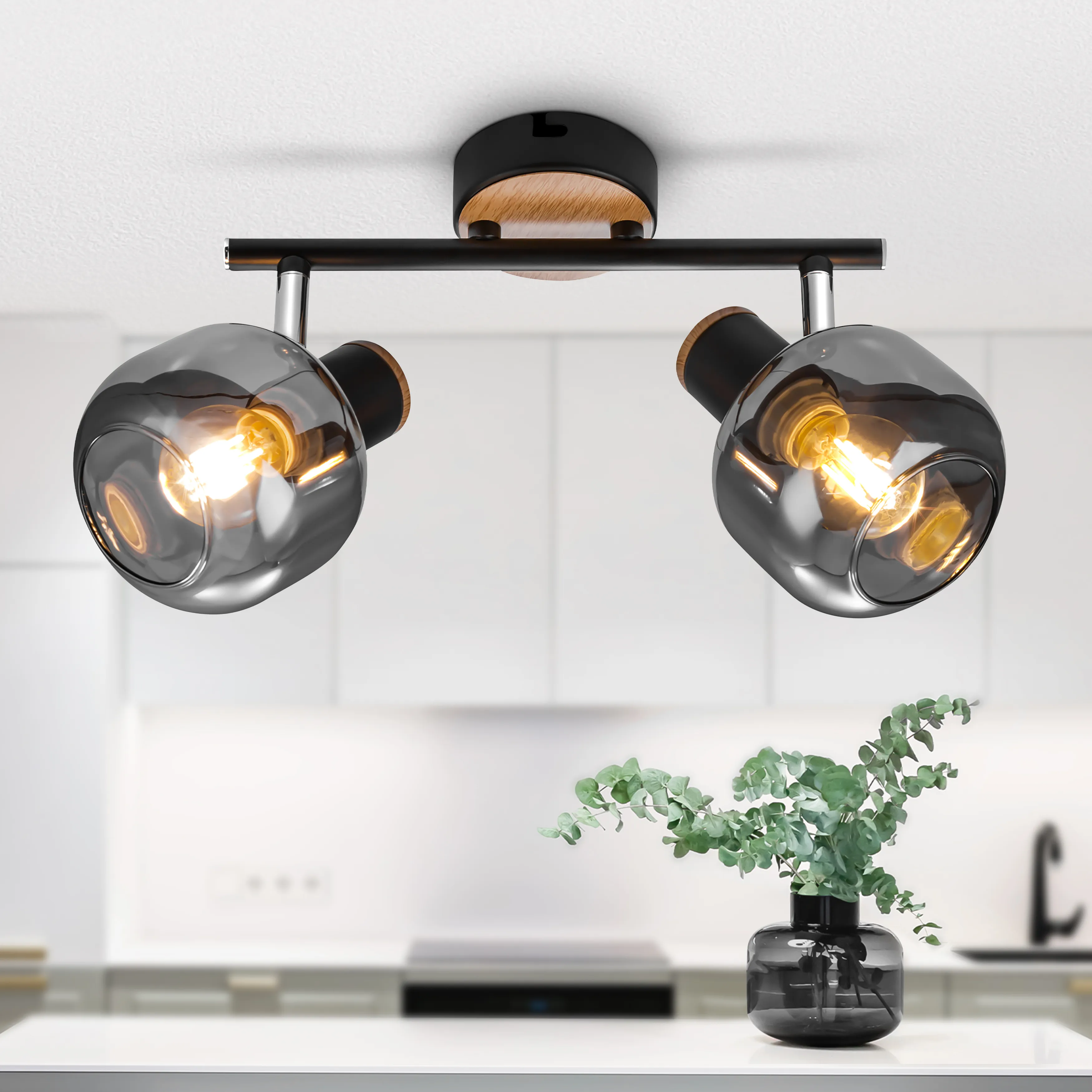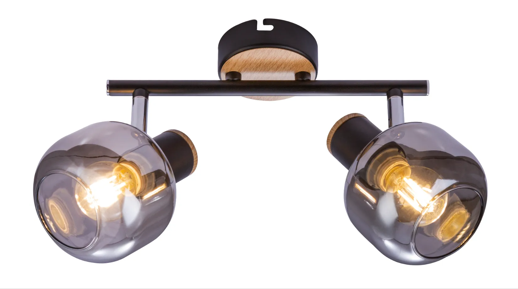 <p>Броский дизайн этих светильников достигается сочетанием контрастных оттенков затемнённых выдувных плафонов и тёмного металлического каркаса с декоративными элементами из светлого дерева. Споты оснащены долговечными поворотными механизмами высокого качества с надёжной фиксацией. Коллекция представлена настенно-потолочным светильником на 2 лампы.</p>