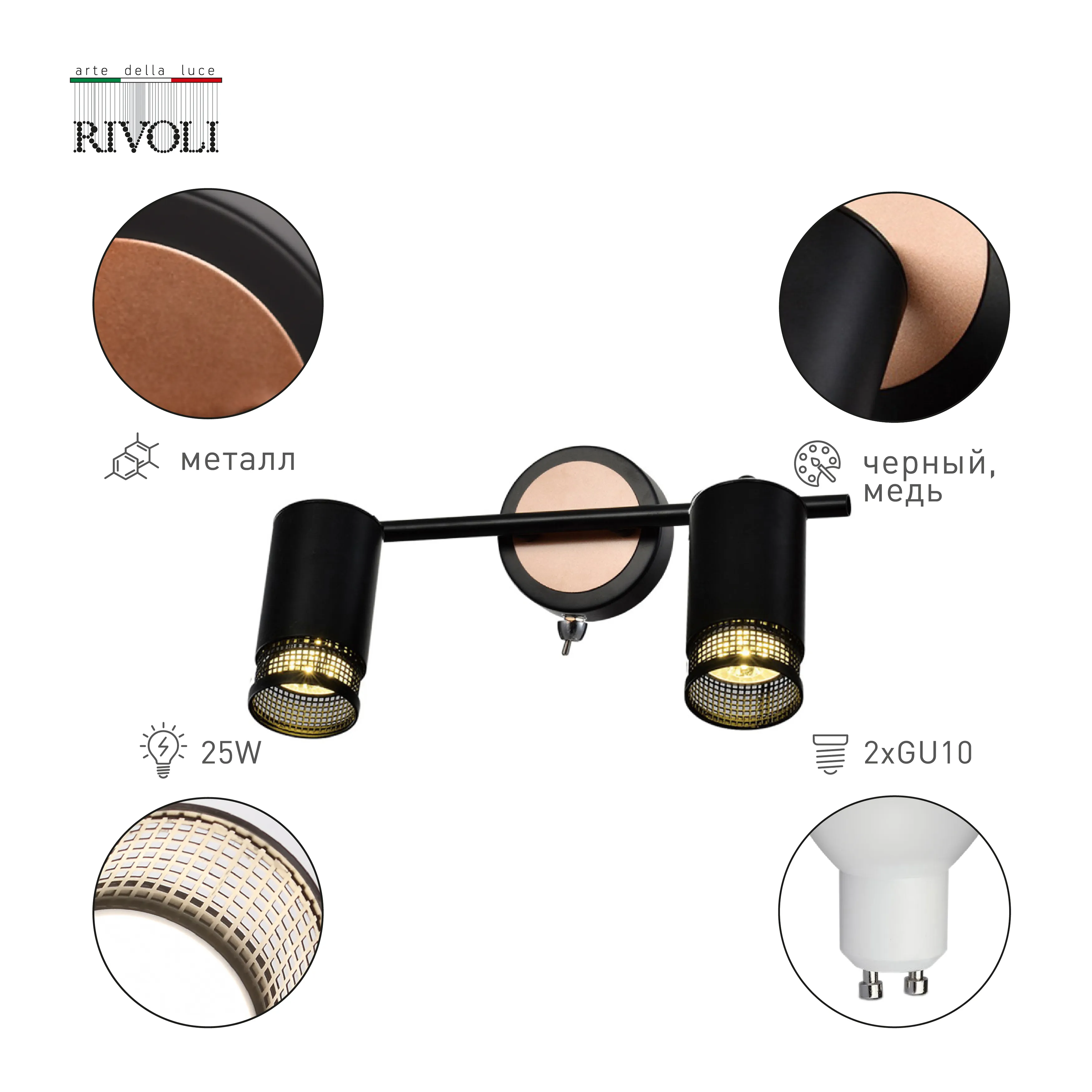 <p>Поворотные споты Lili от итальянского бренда Rivoli отличает красивая перфорация по контуру металлических плафонов. Эти настенно-потолочные светильники применяются с 2 лампами GU10 50 Вт, освещают 6 м².</p><p>В дополнение к данному накладному споту с 2 плафонами (арт. 7020-702) в коллекции Rivoli Lili есть модели под 1, 3 и 4 лампы. Выбирайте настенные светильники под вашу площадь и индивидуальные дизайнерские задачи: арт. 7020-701, 7020-703, 7020-704.</p><p>Споты настенные Lili отличаются удобством использования. Качественный поворотный механизм позволяет легко менять направление света. На корпусе расположен миниатюрный выключатель.</p><p>Приятные отзывы получает и дизайн этих эффектных спотов из металла. Лаконичные формы и трендовое окрашивание в черный и медь делают Rivoli Lili универсальным способом преображения интерьера в стиле лофт, кантри, ретро, классика, скандинавский, минимализм. </p><p>Купить эти яркие споты стоит для спальни, кухни, гостиной, столовой, загородного дома, детской комнаты, прихожей.</p>