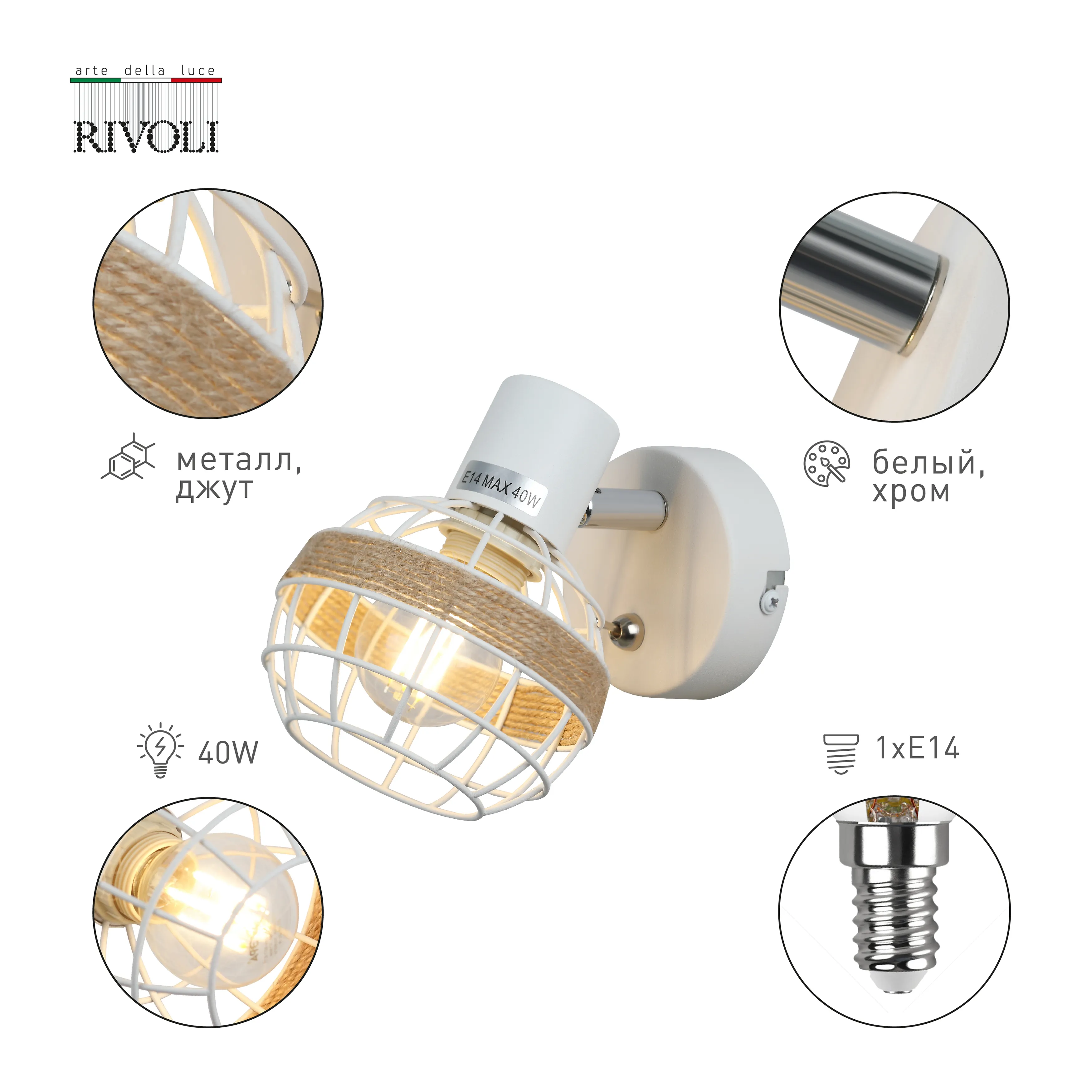 Стильные белые поворотные споты с решетчатыми плафонами, декорированные джутом. Доступны в вариантах на 1, 2 и 3 лампы, идеально подходящих для любого интерьера. Эти светильники добавят уюта в атмосферу вашего дома