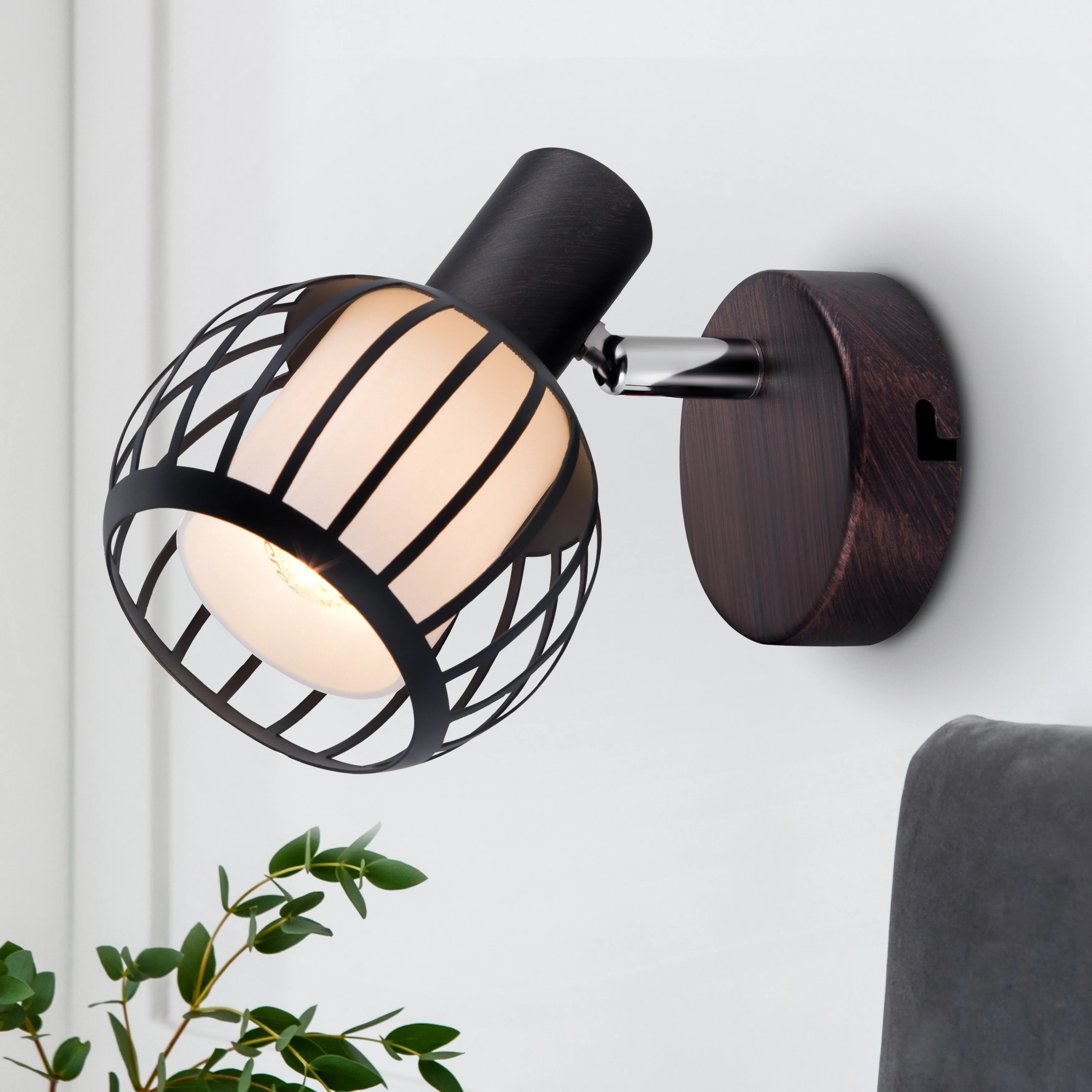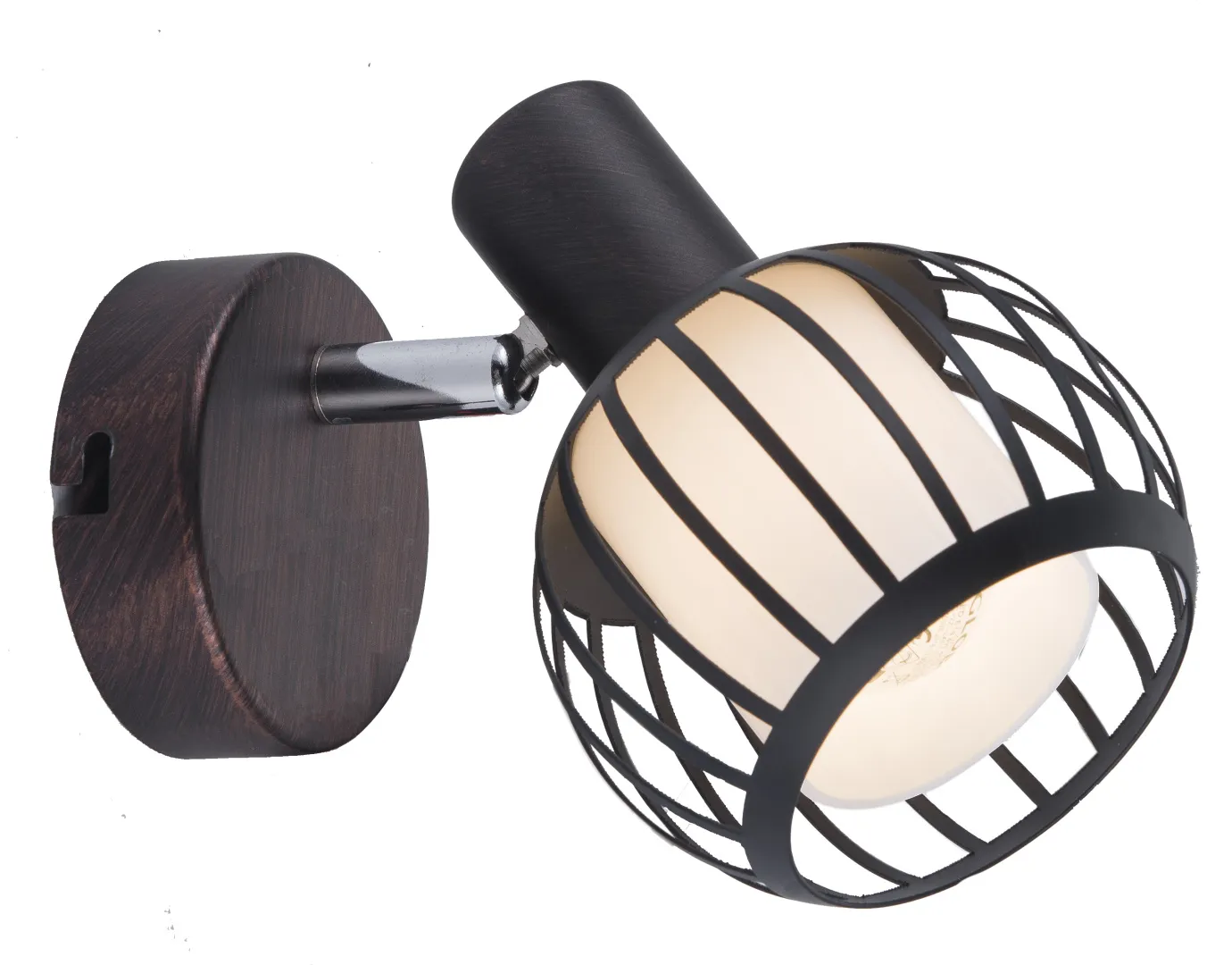 Лаконичные споты с поворотным механизмом. Позволяют организовать многоярусное освещение, зонировать и разнообразить пространство за счёт оригинального света. Простое функциональное решение для акцентной подсветки в гостиной, коридоре, на кухне, в кабинете, мастерской. Часто применяются в оформлении интерьеров кафе, гостиниц, общественных пространств. Rivoli Enio отличаются стильным комбинированным плафоном: за тонкими металлическими прутьями прячется матовая колба из белого стекла. Коллекция представлена спотом на 1 лампу.