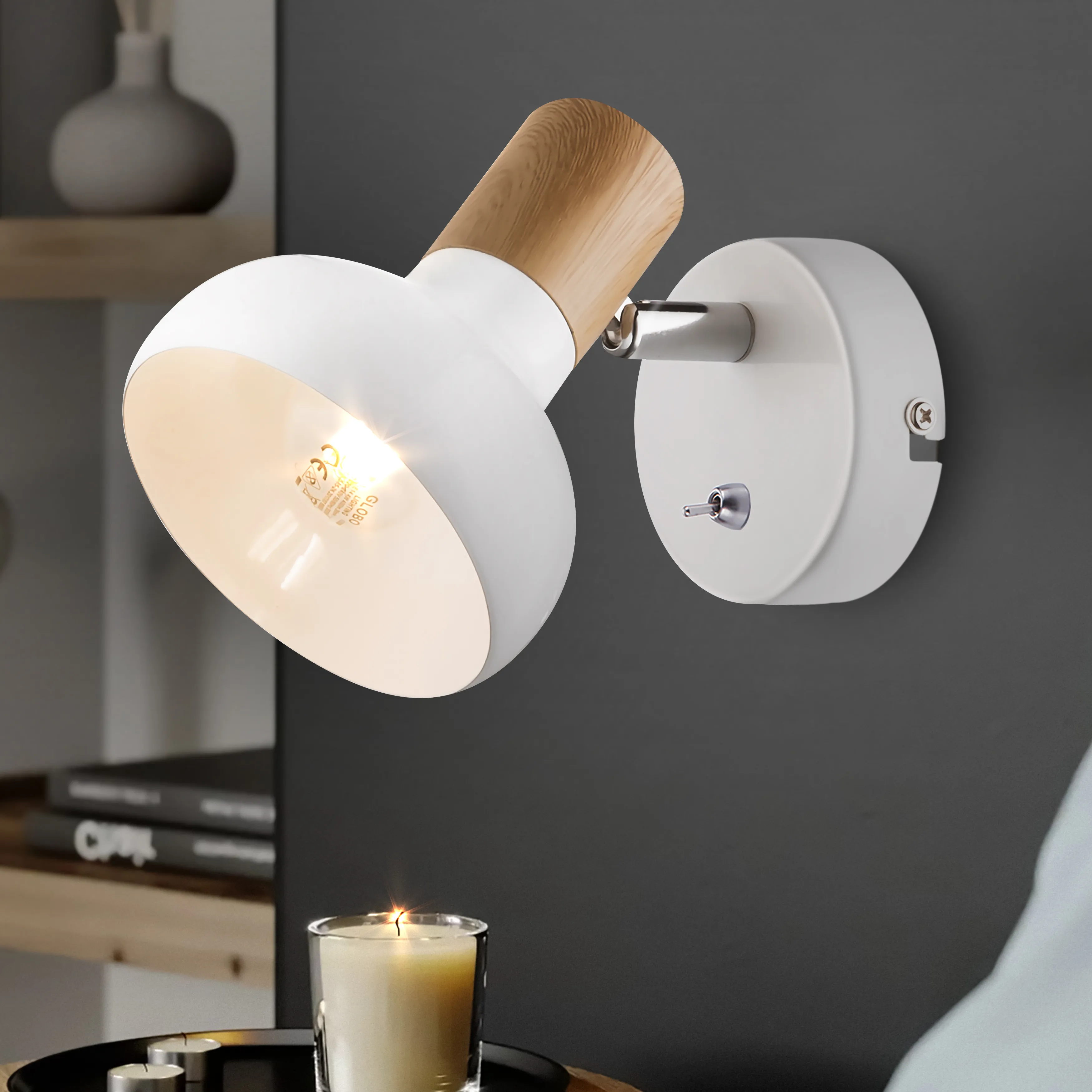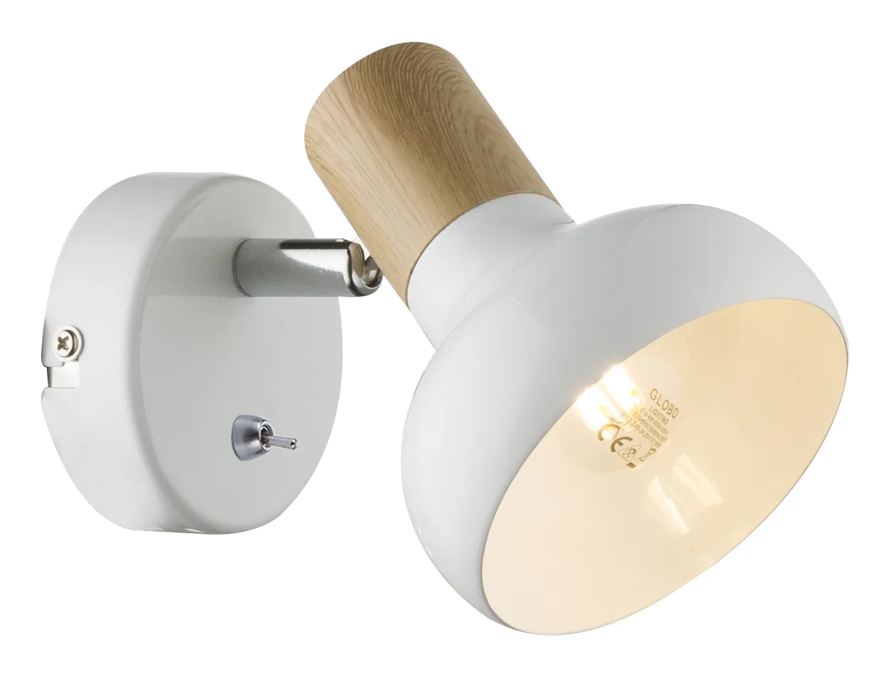 Rivoli Lorena - металлический спот белого матового цвета с отделкой элементов под светлое дерево. Один плафон под лампу Е14 40 Вт. Спот поворотный - вы с удобством и в любой момент сможете регулировать направление освещения. Это преимущество делает данный светильник идеальным вариантом бра над кроватью, бра над столом, бра в спальню, бра в прихожую. Настенно-потолочный спот с выключателем на корпусе. Выключатель и миниатюрный рожок плафона имеют красивое хромированное покрытие.