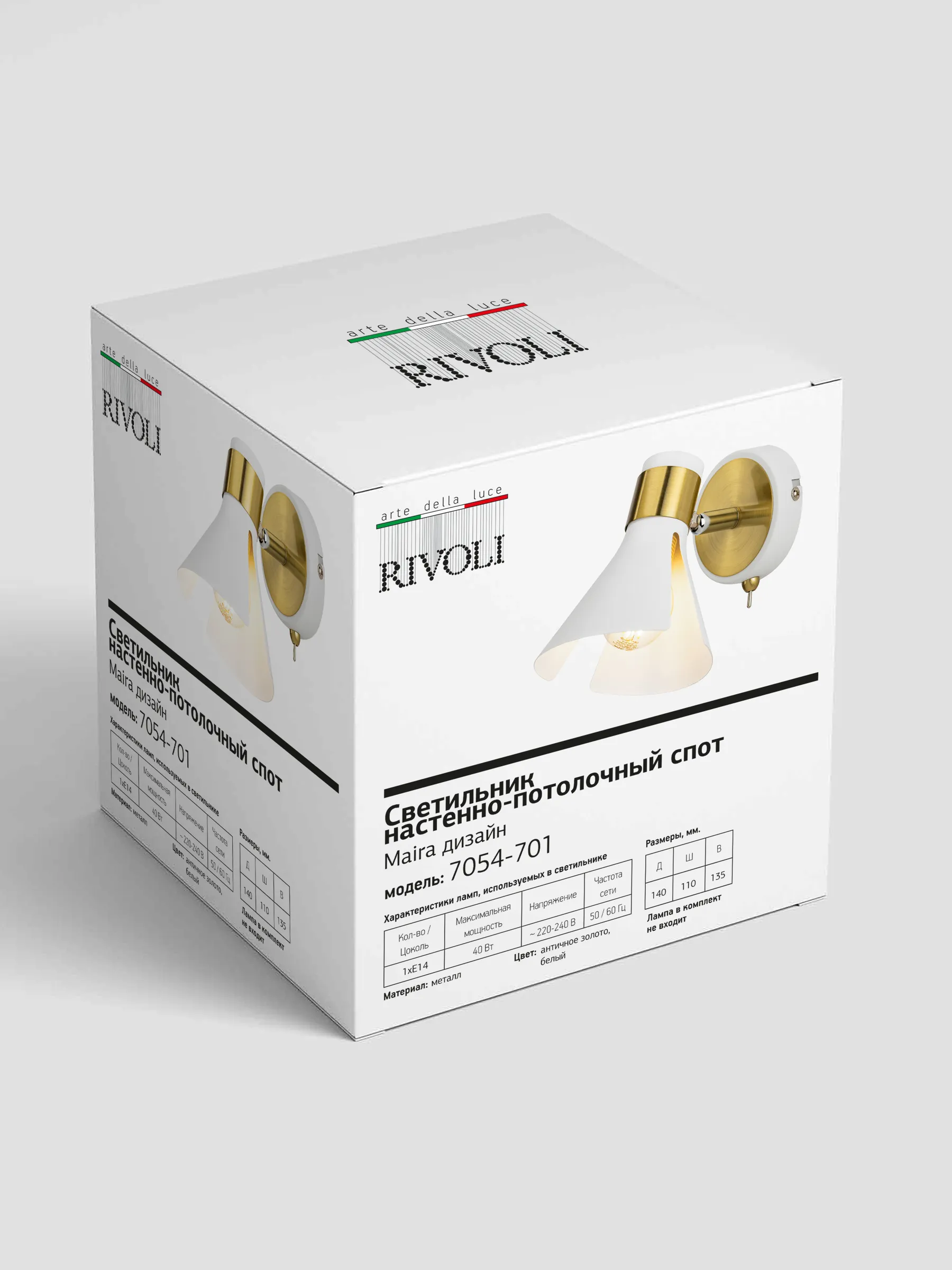 Коллекция Maira от итальянского бренда Rivoli – это светильник настенный поворотный (арт. 7054-701) и потолочная люстра с 5 плафонами (арт. 7054-735). Прочные люстры и светильники из металла имеют современный элегантный дизайн в сочетании белого цвета и цвета античное золото. Применено гальваническое окрашивание, надолго сохраняющее целостность и оттенок покрытия.