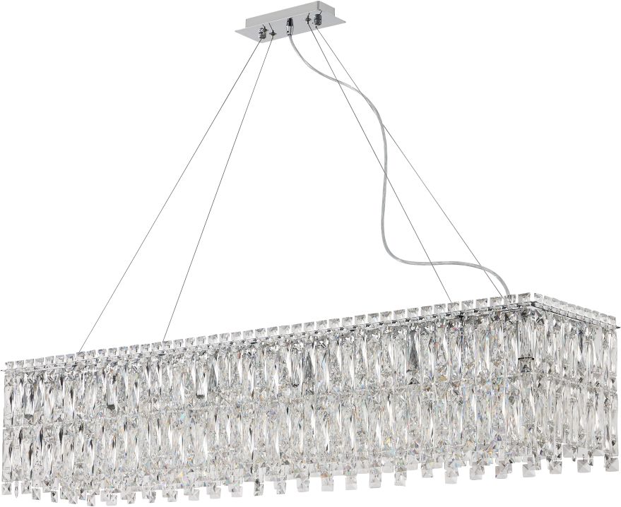 Люстра подвесная вытянутой формы из коллекции Santorini выполнена из металkической арматуры, гальванизированной в цвет хрома, и декорирована узкими прямоугольными подвесками из хрусталя высшего качества. Современная форма и высокое качество светильников идеально подойдут как в классические, так и современные интерьеры. Из данной коллекции светильников можно сделать индивидуальный заказ любого цвета и размера.