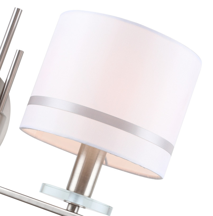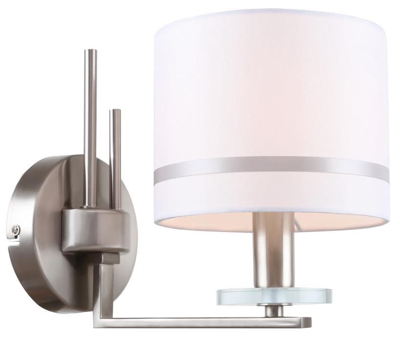 Светильник настенный из коллекции Chart выполнен из металла, гальванизированного в цвет никеля, и декорирован железными стержнями в цвет арматуры. Текстильный абажур белого цвета с термостойким акрилом внутри отделан кантом в цвет арматуры. Декоративная розетка выполнена из прозрачного стекла.