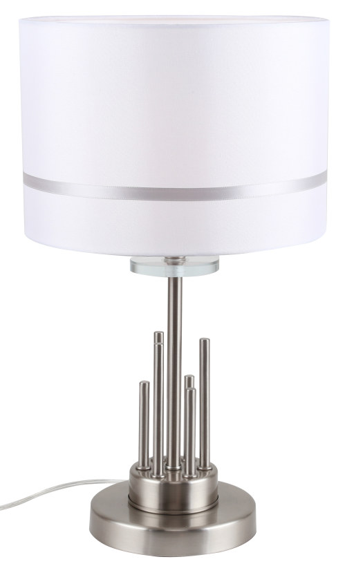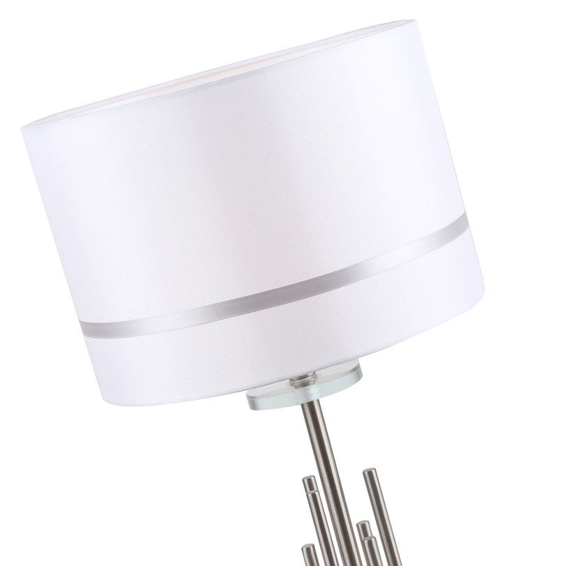 Светильник настольный из коллекции Chart выполнен из металла, гальванизированного в цвет никеля, и декорирована железными стержнями в цвет арматуры. Текстильный абажур белого цвета с термостойким акрилом внутри отделан кантом в цвет арматуры. Декоративная розетка выполнена из прозрачного стекла.