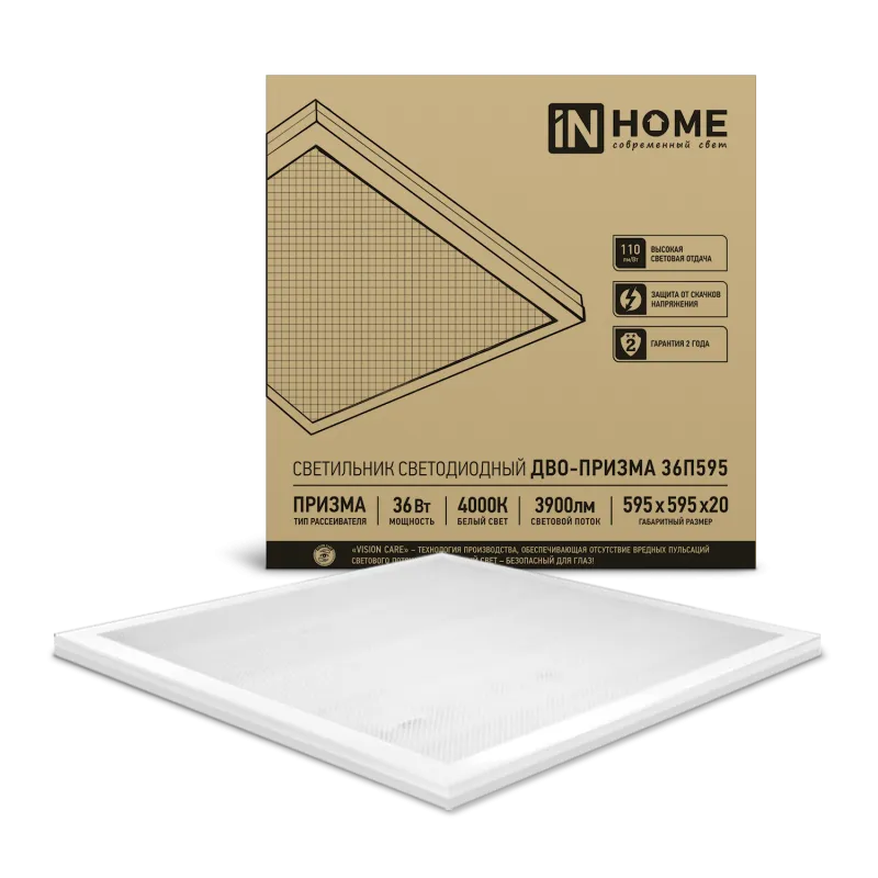 Светильник светодиодный ДВО-ПРИЗМА 36П595 36Вт 4000К 3900Лм 110Лм/Вт 595х595х19 IN HOME 4690612034546