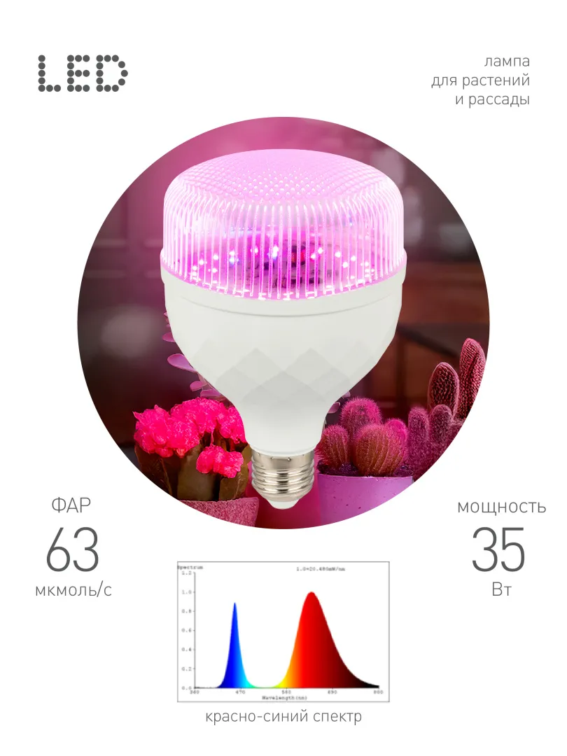 Мощная фитолампа красно-синего спектра — надёжный помощник в выращивании рассады, комнатных цветов, зелени и пасленовых. Создаёт комфортные условия для роста и развития растений, стимулируя набор питательных веществ и рост листьев. Мощность — 35 Вт. Цоколь — Е27. Рекомендуемое расстояние до листьев — 30–60 см. Время освещения — 8–14 часов, с темновой фазой 7 часов. Лампа излучает сбалансированный свет с соотношением синего и красного спектров 1:3, что способствует укреплению стеблей и росту плотных листьев. Использование прозрачного поликарбонатного рассеивателя повышает эффективность светового потока.
