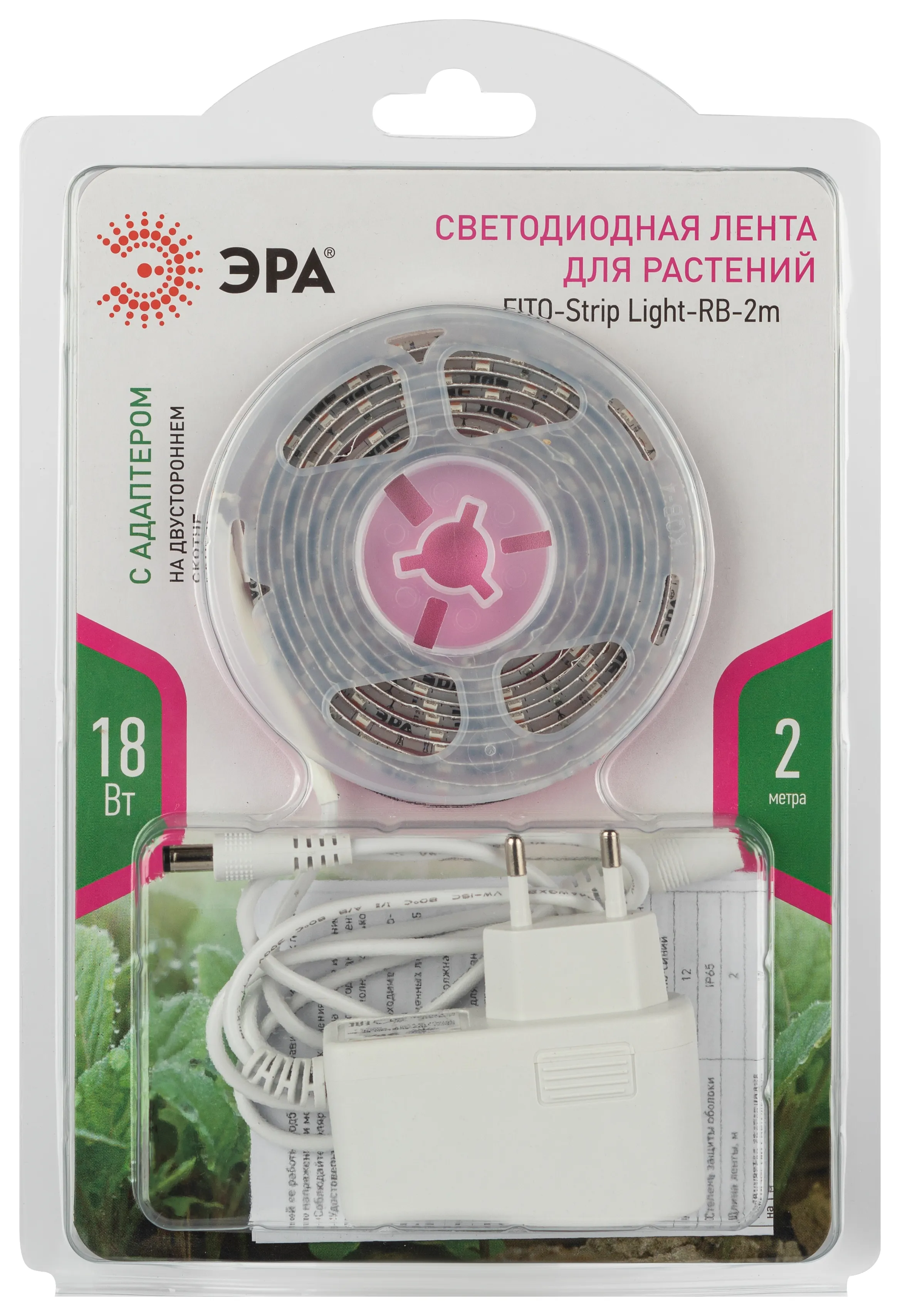 LED-лента для роста и развития растений с драйвером в комплекте. Наличие штекерного адаптера обеспечивает более высокий КПД по сравнению с лентами, оснащёнными USB-адаптерами. Высокая светоотдача — 60 светодиодов красно-синего спектра на 1 метр ленты. Быстро устанавливается на любые гладкие поверхности и может переклеиваться несколько раз. Фитолента ЭРА с силиконовым покрытием имеет повышенную прочность. Длина шнура адаптера — 1 метр. Длина LED-ленты — 2 метра. Силиконовое покрытие работает как рассеивающая линза, уменьшая осевую силы света и создавая более мягкое для глаз свечение. Фотонный поток с 1 метра ленты — 11 мкм/с. Мощность фитоленты ЭРА — 18 Вт. Напряжение на выходе адаптера — 12 вольт.