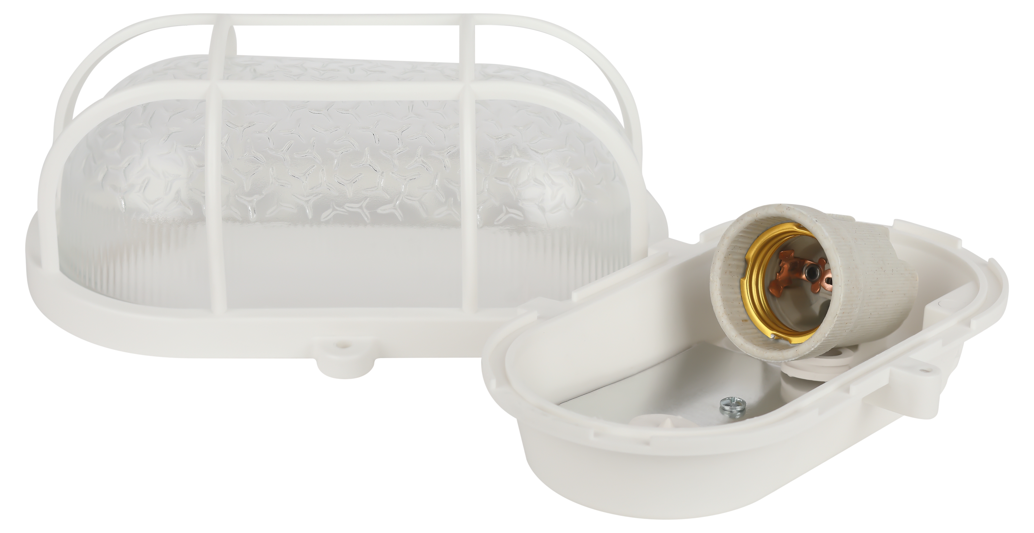 Светильник ЭРА НБП 01-60-002 с решеткой Евро пластик / стекло IP53 E27 max 60Вт 184х115х90 овал белый. Используется для освещения жилых, подсобных, общественных и производственных помещений.