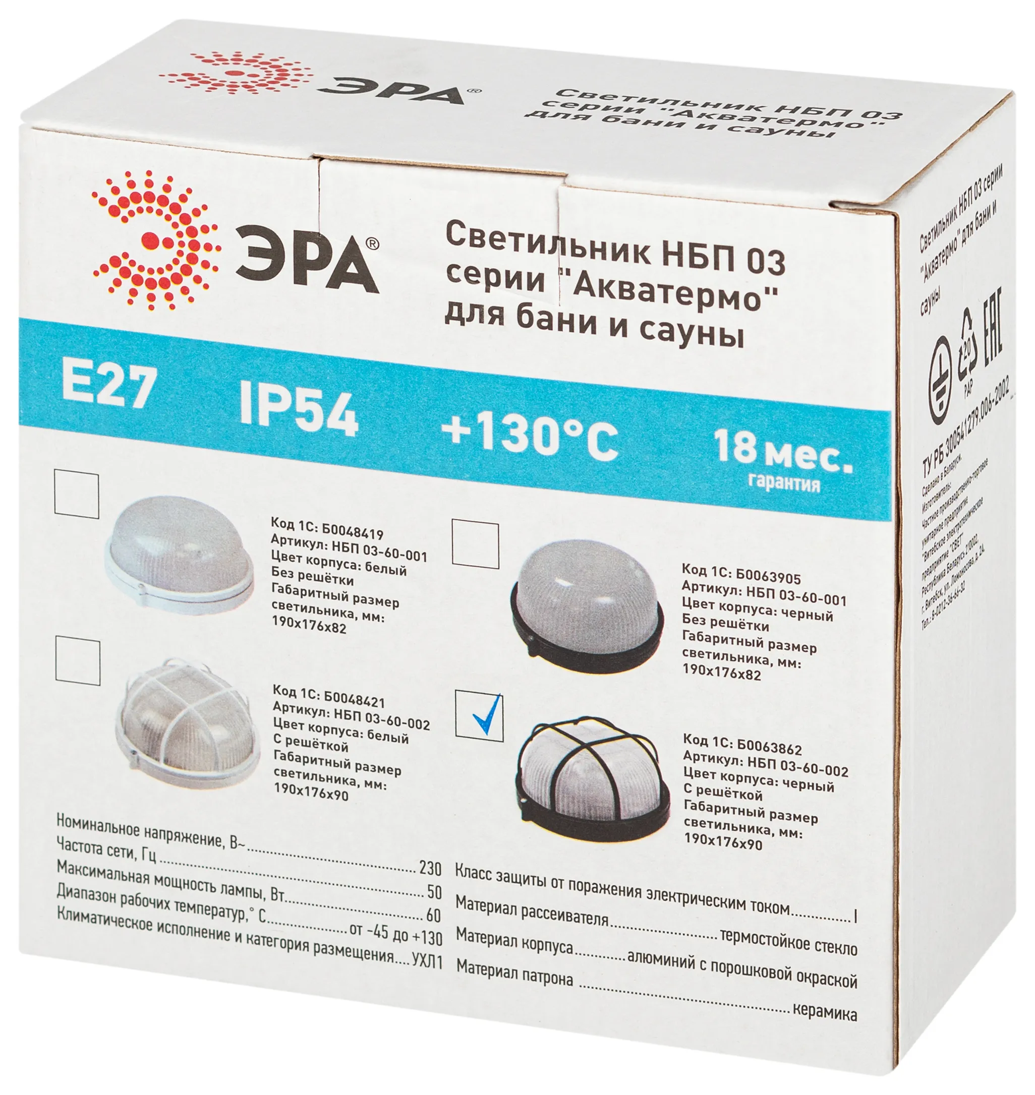 Термостойкий светильник серии "Акватермо". Так называемые светильники-банники имеют специальную конструкцию, позволяющую эксплуатировать эти модели на объектах с повышенным уровнем влажности - бани, бассейны, автомойки, склады, гаражи. Серия "Акватермо" представлена в широком диапазоне параметров (мощность, размеры), некоторые модели дополнены защитной решеткой. Выпускаемые пылевлагозащищенные светильники отличаются надежностью, практичностью, безопасностью, устойчивостью к агрессивным климатическим и механическим воздействиям. Имеют широкий диапазон рабочих температур: от -45°С до +130°С. Материал рассеивателя: селикатное стекло. Материал корпуса: черный алюминий. Источник света: лампа с цоколем Е27. Степень защиты от окружающей среды - IP54.