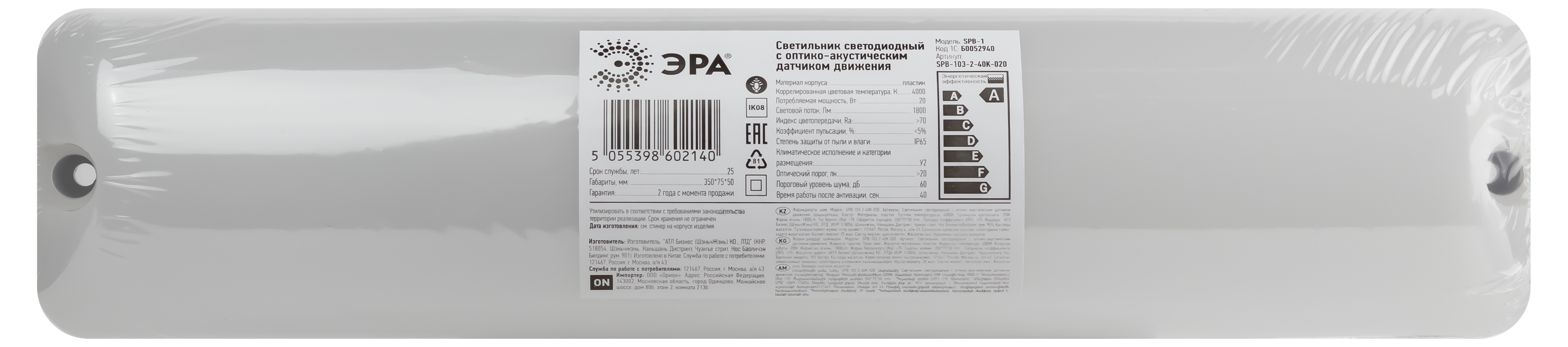 Светильник жкх светодиодный эра spb-103-2-40k-020 20вт 4000k 1900лм ip65 350х75х50 оптико-акустический датчик движения