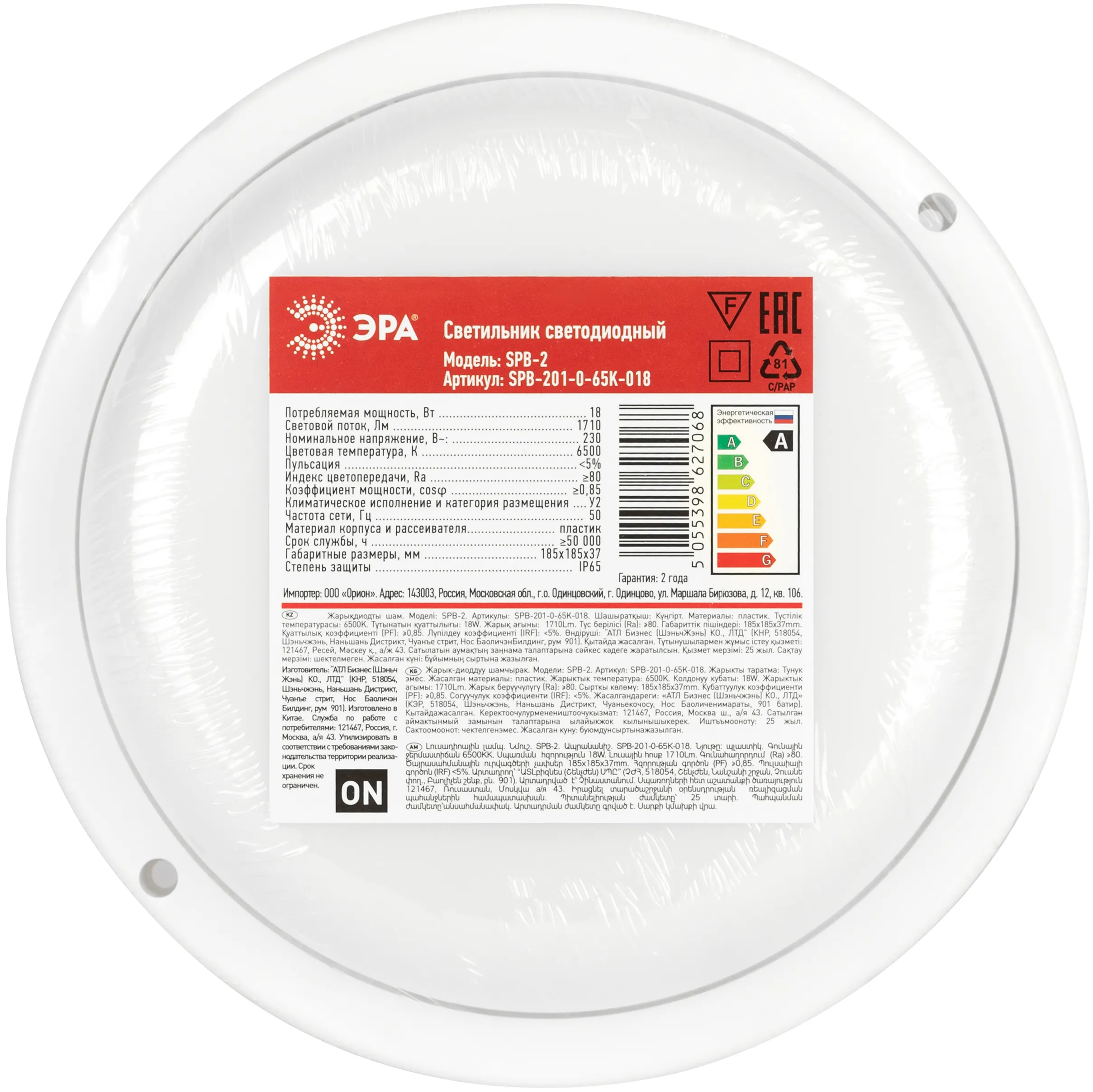 Светильник жкх светодиодный эра spb-201-0-65k-018 настенно-потолочный ip65 18вт 6500к 1710лм 185x185x37 матовый