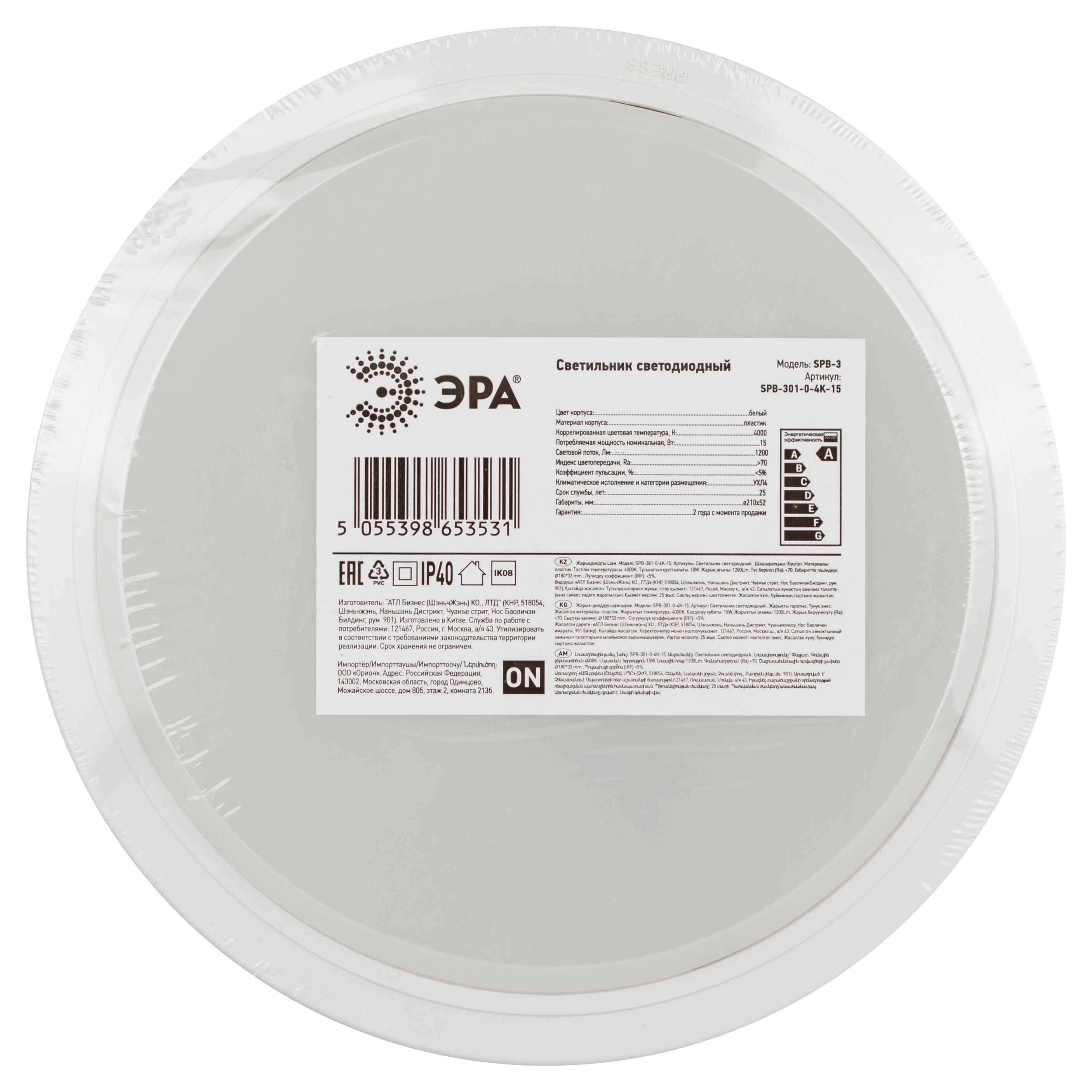 Светильник жкх светодиодный эра spb-301-0-4k-15 ip40 15вт 1500лм 4000k 155х155х33 круг накладной