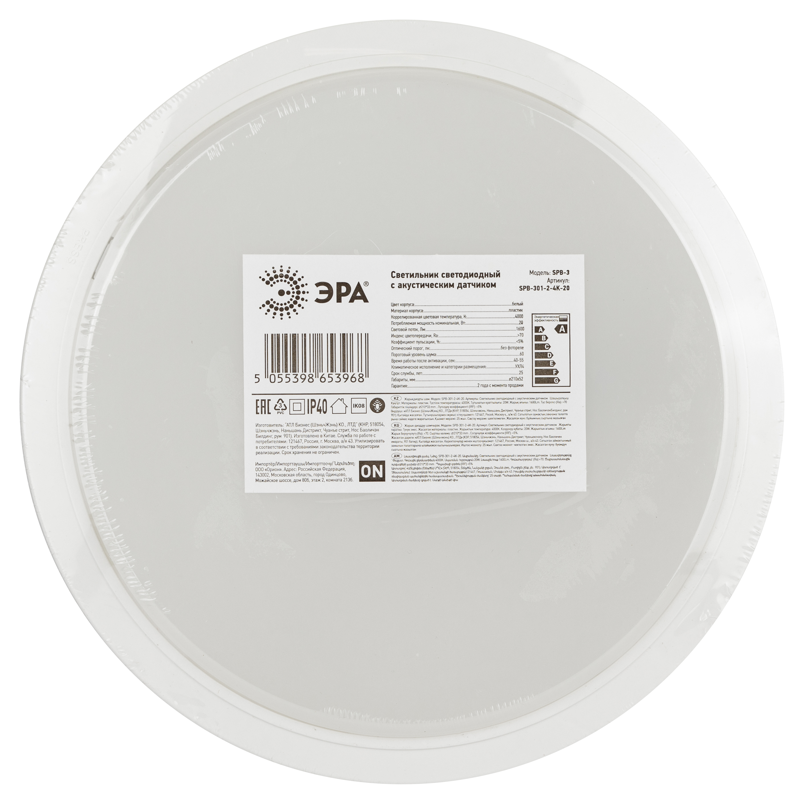Светильник жкх светодиодный эра spb-301-2-4k-20 ip40 20вт 1600лм 4000к 210х210х33 c акустическим датчиком круг накладной