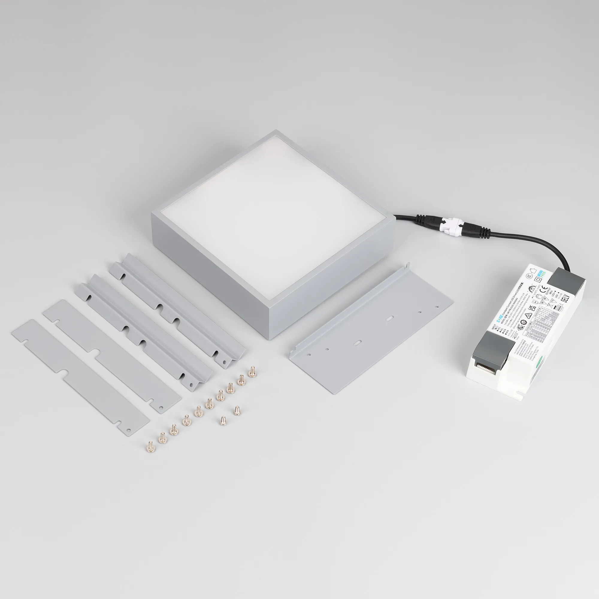 Встраиваемый светильник даунлайт для установки в потолки Грильято с размером ячейки 150х150 мм и высотой направляющих 30, 40 или 50 мм. Мощность 18 Вт, св. поток 1491 лм, 85 лм/Вт, тёплый 3000 K, CRI>90, угол 100°, напряжение питания 230 В. Серый квадратный корпус из алюминия (RAL7045), степень защиты IP40. Размер: длина 140 мм, ширина 140 мм, высота 40 мм. Монтаж встраиваемый, установочное отверстие: длина 140 мм, ширина 140 мм. Драйвер 24-42 В, 450 мА, пульсация <1%.