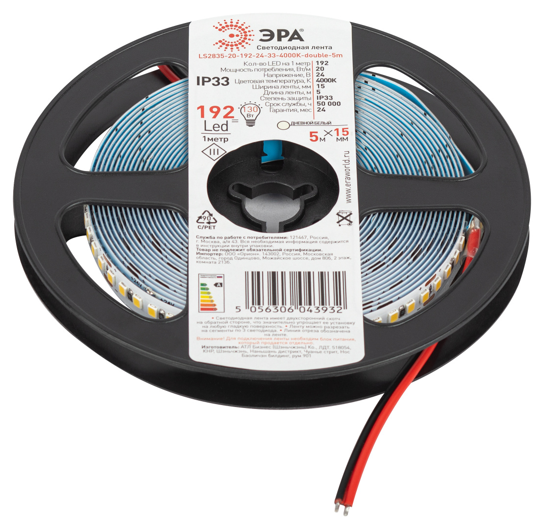 ЭРА Лента светодиодная LS2835-20-192-24-33-4000К-double-5m (25/50/300) со степенью защиты от пыли и влаги IP20 - современный способ создания внутреннего освещения, подсветки ниш, лестничного пространства, систем хранения, а также декоративного и художественного оформления любых объектов и форм в помещениях. Легко и быстро устанавливается на любой гладкой поверхности с помощью скотча, расположенного на оборотной стороне ленты Используя алюминиевый профиль, можно создавать необычные и функциональные решения освещения в Вашем интерьере. Рабочее напряжение ленты составляет 24В, а мощность равна 20Вт/м. Светодиодная лента обладает световым потоком 1300 Лм/м, и цветом свечения - дневной белый (4000 К)