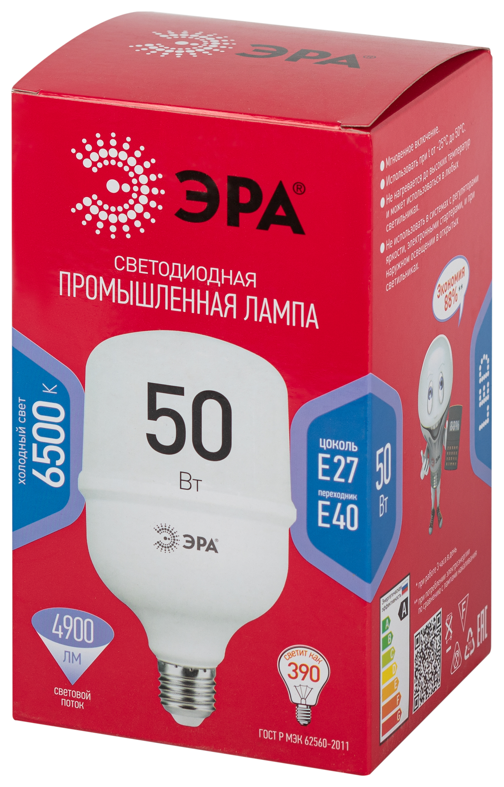 Светодиодная лампа повышенной мощности ЭРА RED LINE LED POWER T100-50W-6500-E27/E40 R идеальна для качественного и экономичного освещения пространств с большой площадью производственных, торговых, выставочных, складских, подсобных помещений. Светит ярко, как лампа накаливания 390 Вт, при этом потребляет мощность всего 50 Вт. Экономит до 90% электроэнергии. Светит холодным белым светом, который способствует концентрации внимания и повышает работоспособность. Не нагревается, включается мгновенно, не мигает. Размеры: 178 х 102 мм. Цоколь Е27/E40