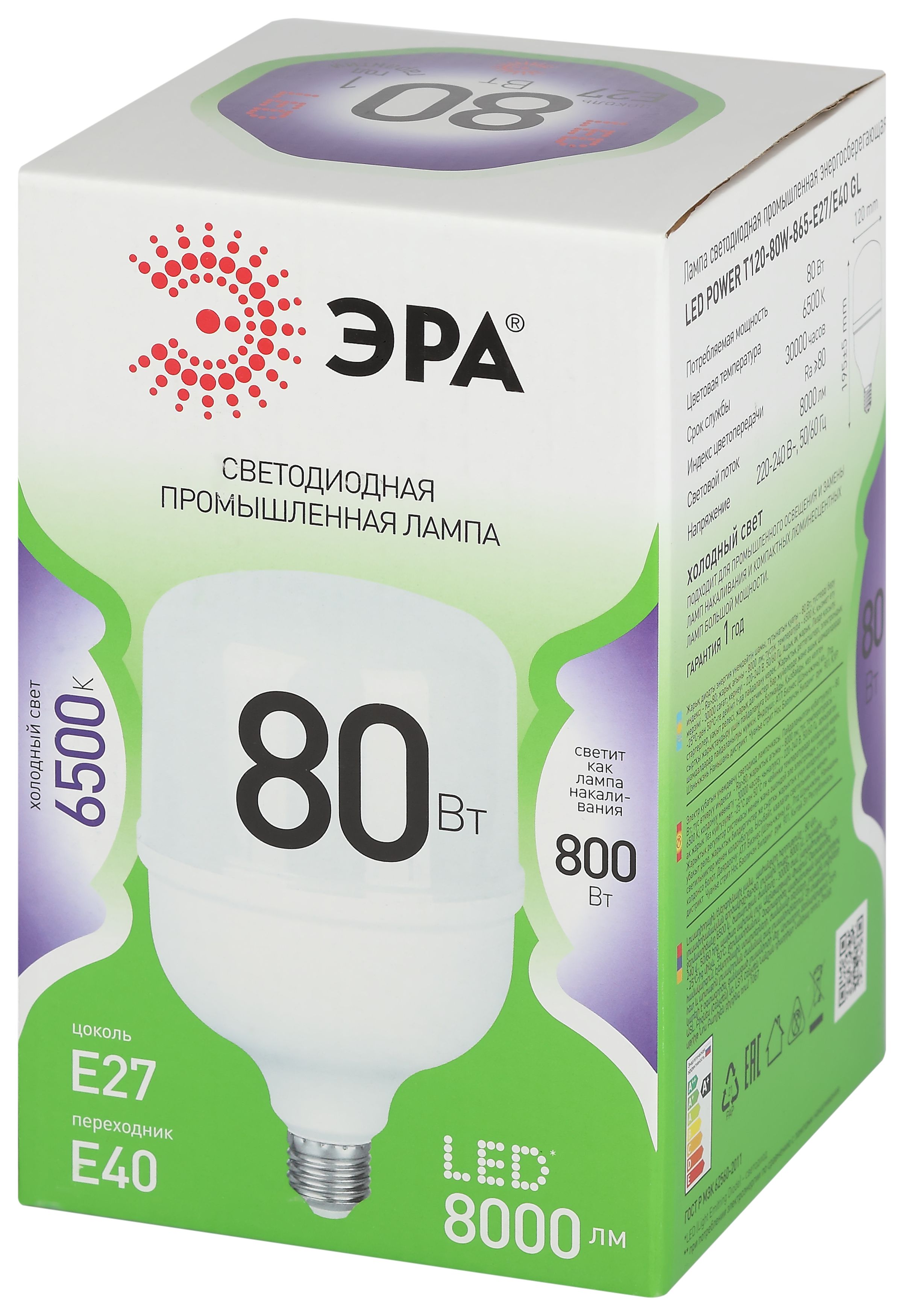 | Светодиодная лампа ЭРА LED POWER T120-80W-865-E27/E40 GL серии Green Line — универсальный и энергоэффективный источник света. В комплекте предусмотрен сменный цоколь Е40, что позволяет использовать лампочку в различных помещениях. Цветовая температура 6500К излучает холодный белый свет без мерцаний. Высота лампы: 195 мм. Плафон в форме колокола обеспечивает равномерное распределение света. Лампочка ЭРА Е27 отличается низким энергопотреблением, долгим сроком службы и устойчивостью к перепадам напряжения. Работает от сети 220 В, эквивалентна 800 Вт лампе накаливания. Подходит для освещения жилых помещений, офисов, магазинов и производственных площадей. |