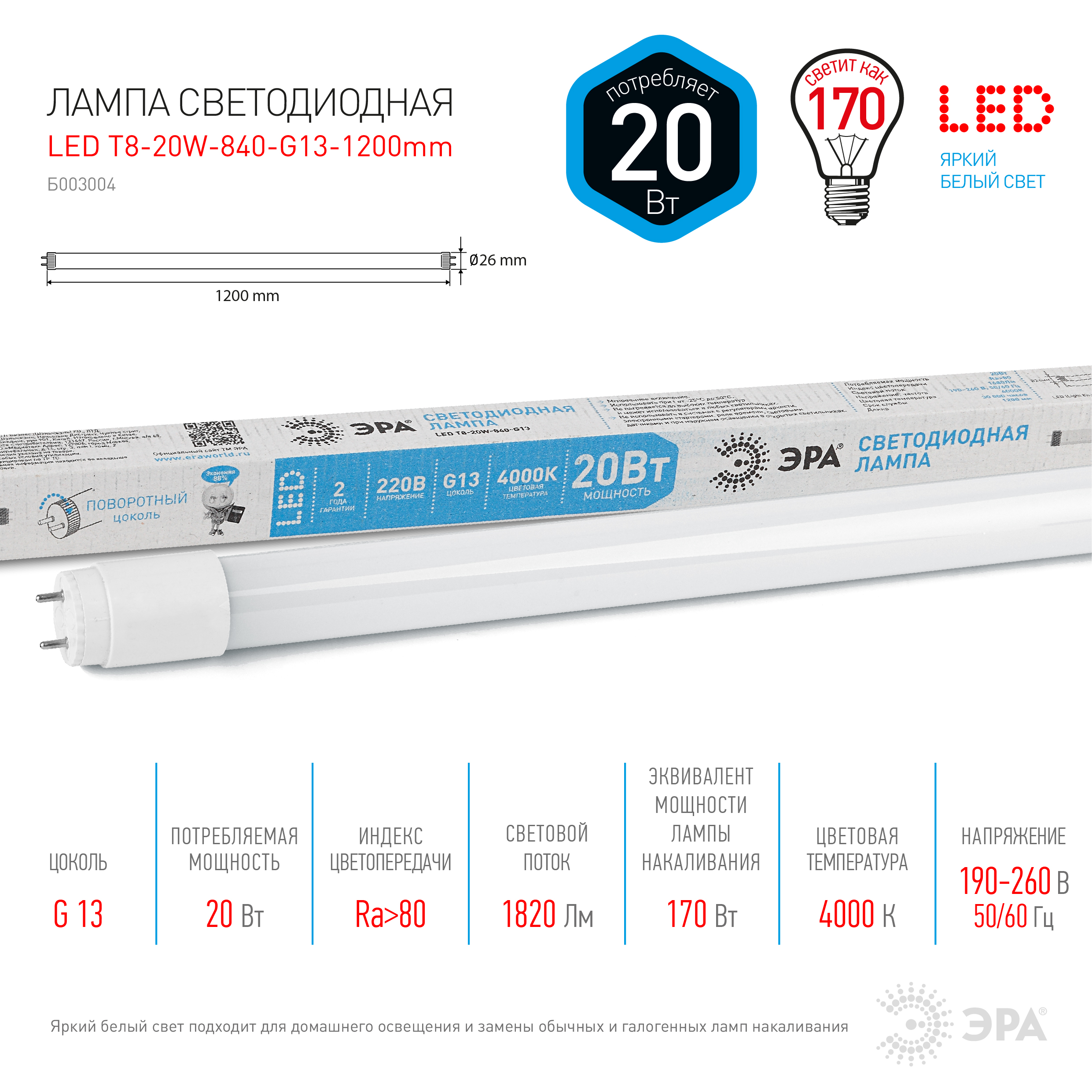 Лампа светодиодная эра led t8-20w-840-g13-1200mm б0062407