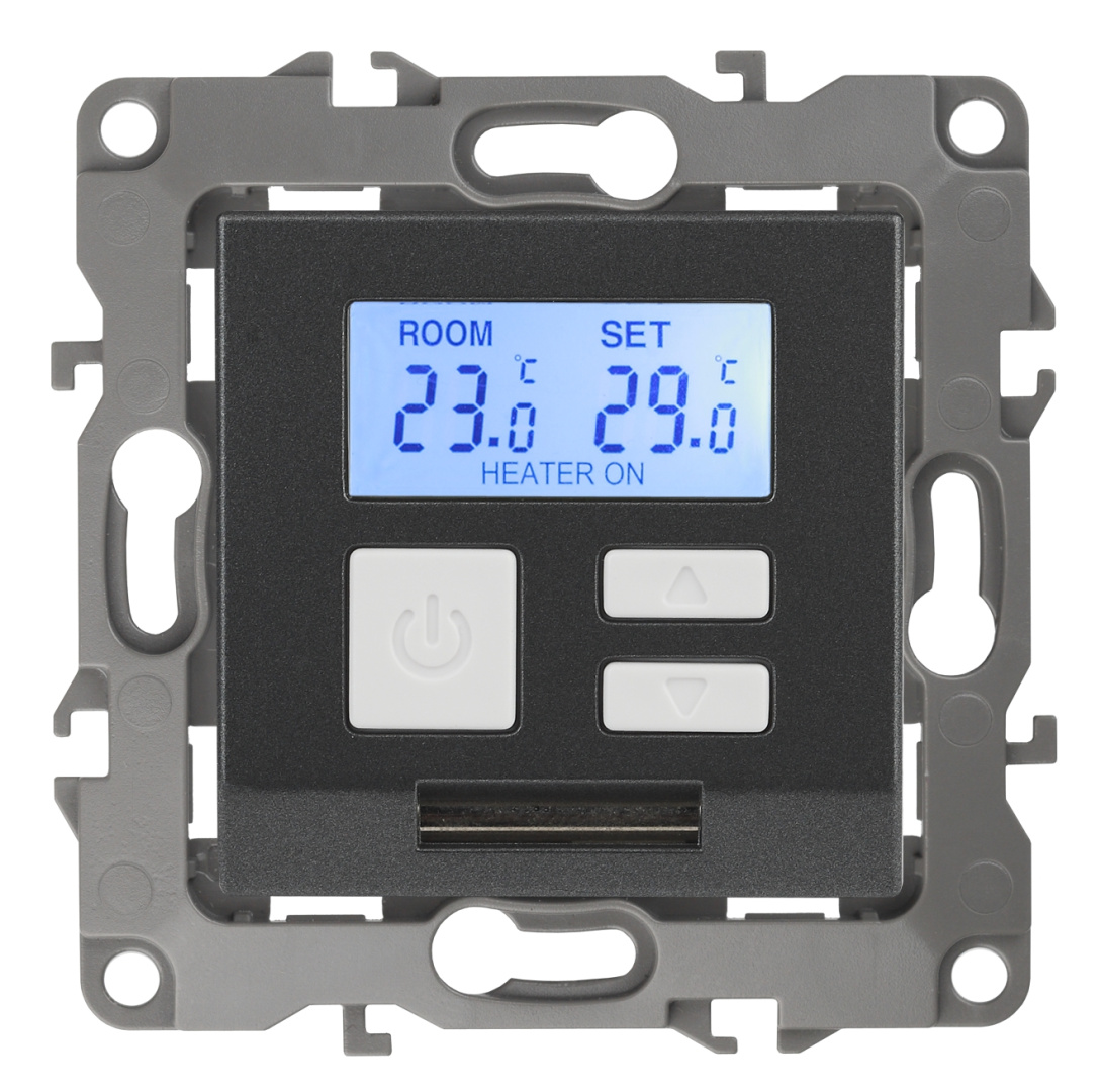 Терморегулятор теплый пол / отопление электронный серии Эра 12 СУ механизм цвет графит 12-4111-12. Номинальные характеристики 16А 230В. Сделана из поликарбоната. Монтаж в подрозетник производится и на лапки, и на винты. Рамки приобретаются отдельно. Рамки Эра 12: 1 пост 12-5001-хх, 2 поста 12-5002-хх, 3 поста 12-5003-хх, 4 поста 12-5004-хх, 5 постов 12-5005-хх. Рамки Эра 12 Сатин: 1 пост 12-5101-хх, 2 поста 12-5102-хх, 3 поста 12-5103-хх, 4 поста 12-5104-хх, 5 постов - 12-5105-хх (хх - код цвета: 01-белый, 02-слоновая кость, 03-алюминий, 04-шампань, 05-антрацит, 06-чёрный, 07-ольха(белёный дуб-сатин), 08-вишня, 09-дуб, 10-венге, 11-сосна, 21-жёлтый, 22-оранжевый, 23-красный, 24-охра, 25-бордо, 26-лайм, 27-зелёный, 28-голубой, 29-синий).