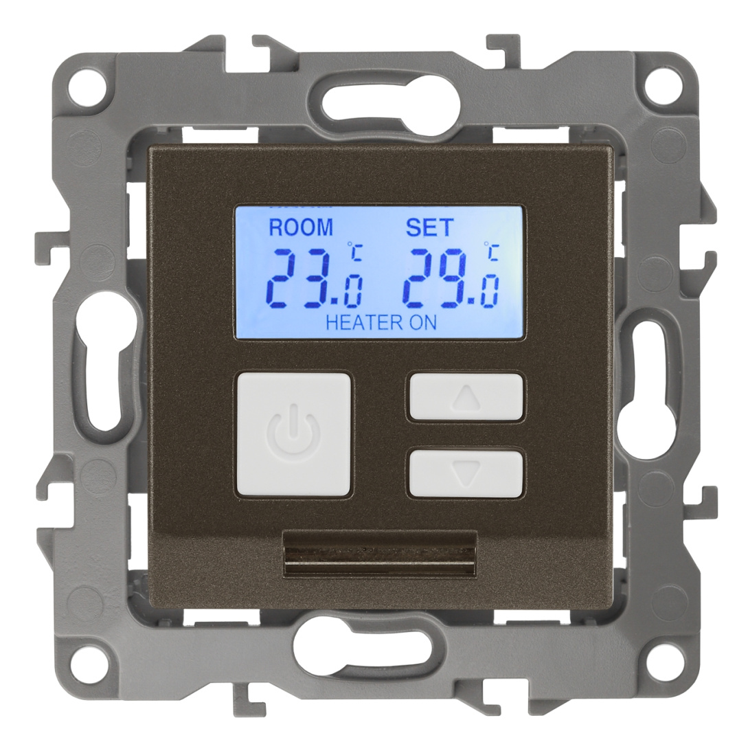 Терморегулятор теплый пол / отопление электронный серии Эра 12 СУ механизм цвет бронза 12-4111-13. Номинальные характеристики 16А 230В. Сделана из поликарбоната. Монтаж в подрозетник производится и на лапки, и на винты. Рамки приобретаются отдельно. Рамки Эра 12: 1 пост 12-5001-хх, 2 поста 12-5002-хх, 3 поста 12-5003-хх, 4 поста 12-5004-хх, 5 постов 12-5005-хх. Рамки Эра 12 Сатин: 1 пост 12-5101-хх, 2 поста 12-5102-хх, 3 поста 12-5103-хх, 4 поста 12-5104-хх, 5 постов - 12-5105-хх (хх - код цвета: 01-белый, 02-слоновая кость, 03-алюминий, 04-шампань, 05-антрацит, 06-чёрный, 07-ольха(белёный дуб-сатин), 08-вишня, 09-дуб, 10-венге, 11-сосна, 21-жёлтый, 22-оранжевый, 23-красный, 24-охра, 25-бордо, 26-лайм, 27-зелёный, 28-голубой, 29-синий).