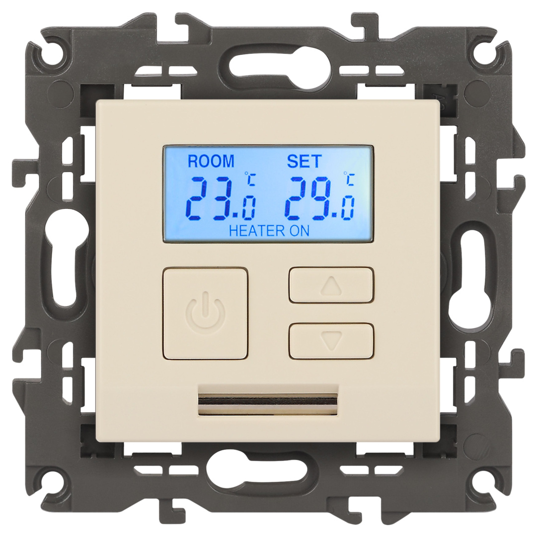 Терморегулятор теплый пол / отопление электронный серии Эра Elegance цвет слоновая кость 14-4111-02. Рамки приобретаются отдельно. Рамки Эра Elegance ПЛАСТИК: 1 пост 14-5001-хх, 2 поста 14-5002-хх, 3 поста 14-5003-хх, 4 поста 14-5004-хх, 5 постов 14-5005-хх; СТЕКЛО: 1 пост 14-5101-хх, 2 поста 14-5102-хх, 3 поста 14-5103-хх, 4 поста 14-5104-хх; МЕТАЛЛ: 1 пост 14-5201-хх, 2 поста 14-5202-хх, 3 поста 14-5203-хх, 4 поста 14-5204-хх; ДЕРЕВО: 1 пост 14-5301-хх, 2 поста 14-5302-хх, 3 поста 14-5303-хх, 4 поста 14-5304-хх (хх - код цвета: 00-прозрачный, 01-белый, белёный дуб, 02-слоновая кость, 03-алюминий, 04-шампань, 05-чёрный, чёрное дерево, 07-ясень, 09-дуб, 10-венге, 11-клён, 14-медь, 21-жёлтый, 22-оранжевый, 23-красный, 25-бордо, 26-лайм, 27-зелёный, 28-голубой, 29-синий, 30-розовый, 31-мокко, 32-серый, 41-сталь, 42-титан).