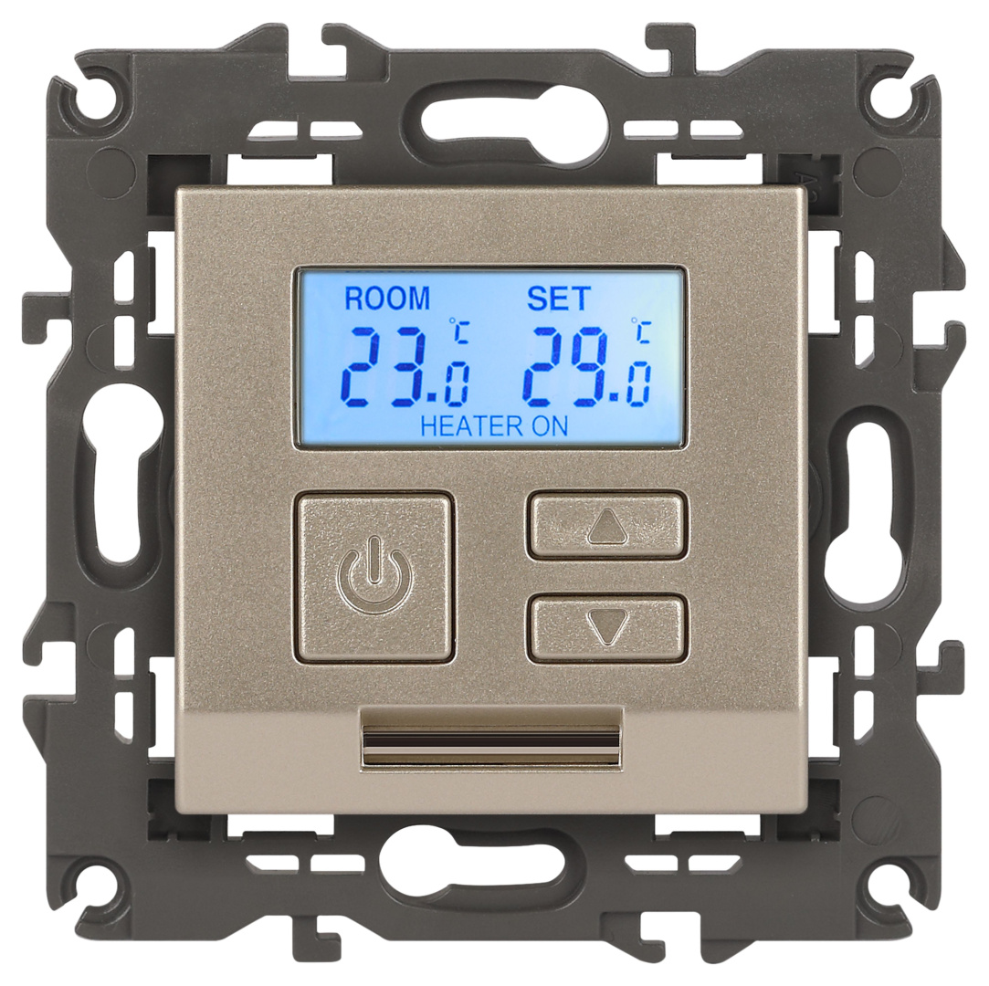 Терморегулятор теплый пол / отопление электронный серии Эра Elegance цвет шампань 14-4111-04. Рамки приобретаются отдельно. Рамки Эра Elegance ПЛАСТИК: 1 пост 14-5001-хх, 2 поста 14-5002-хх, 3 поста 14-5003-хх, 4 поста 14-5004-хх, 5 постов 14-5005-хх; СТЕКЛО: 1 пост 14-5101-хх, 2 поста 14-5102-хх, 3 поста 14-5103-хх, 4 поста 14-5104-хх; МЕТАЛЛ: 1 пост 14-5201-хх, 2 поста 14-5202-хх, 3 поста 14-5203-хх, 4 поста 14-5204-хх; ДЕРЕВО: 1 пост 14-5301-хх, 2 поста 14-5302-хх, 3 поста 14-5303-хх, 4 поста 14-5304-хх (хх - код цвета: 00-прозрачный, 01-белый, белёный дуб, 02-слоновая кость, 03-алюминий, 04-шампань, 05-чёрный, чёрное дерево, 07-ясень, 09-дуб, 10-венге, 11-клён, 14-медь, 21-жёлтый, 22-оранжевый, 23-красный, 25-бордо, 26-лайм, 27-зелёный, 28-голубой, 29-синий, 30-розовый, 31-мокко, 32-серый, 41-сталь, 42-титан).