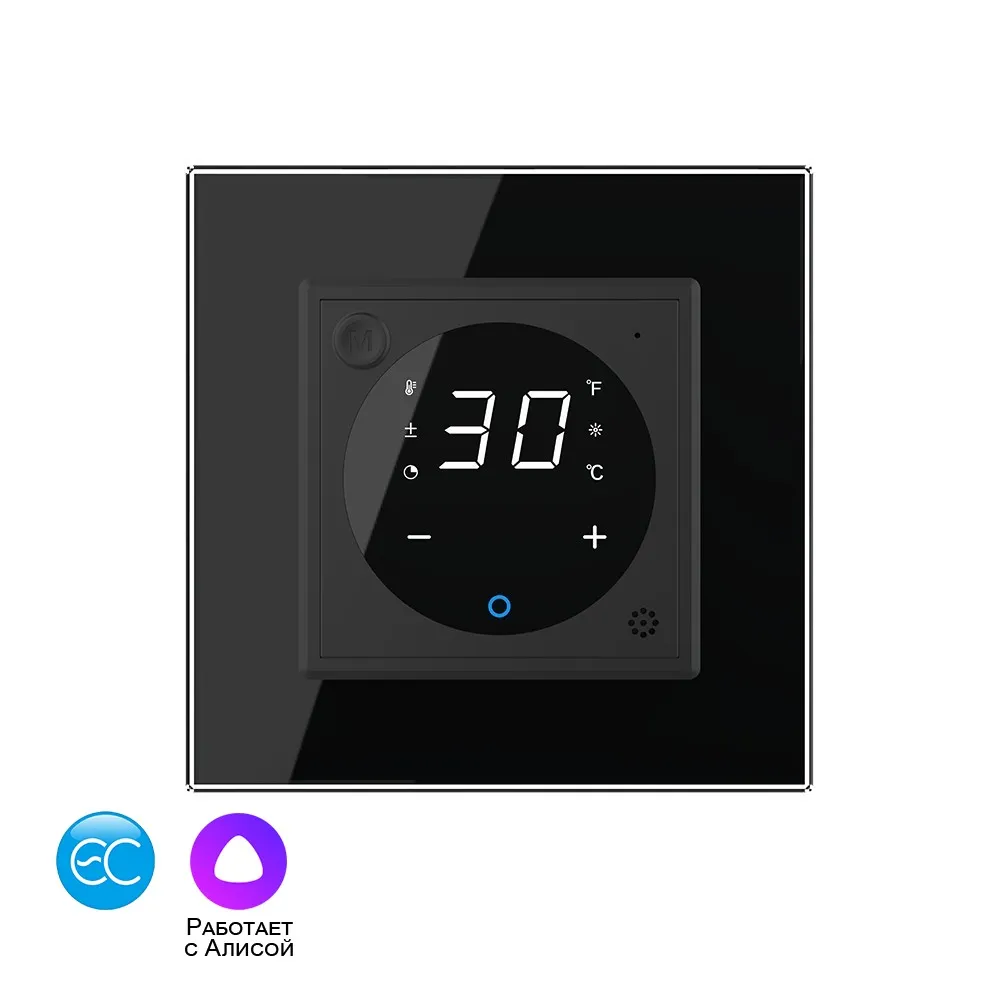 Напряжение питания подается на клемму L (фаза). К клемме L1 подключается нагрузка - фаза от теплого пола. К клемме N терморегулятора и теплого пола подключается нулевой провод. Внешний датчик температуры подключается к клеммам: красный VDD, белый DQ, черный GND. - Устанавливается в круглый подрозетник в комплекте со стеклянной рамкой (в комплекте).