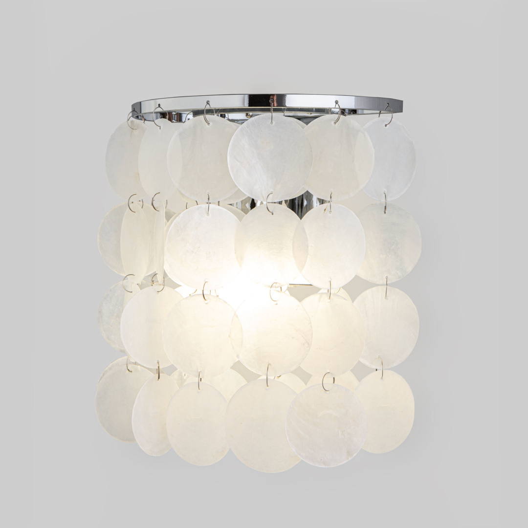 Бра с перламутром 60005/1 хром/перламутр создаст качественное дополнительное освещение и станет ярким дополнением к основному источнику света. Благодаря перламутровому декору, бра создает мягкое рассеянное свечение, подходящее для комфортного чтения книг в вечернее время. В качестве источника света используются сменные лампы типа "Свеча" или "Шар" с цоколем E27. Патрон рассчитан на максимальную мощность ламп накаливания 40 Вт.