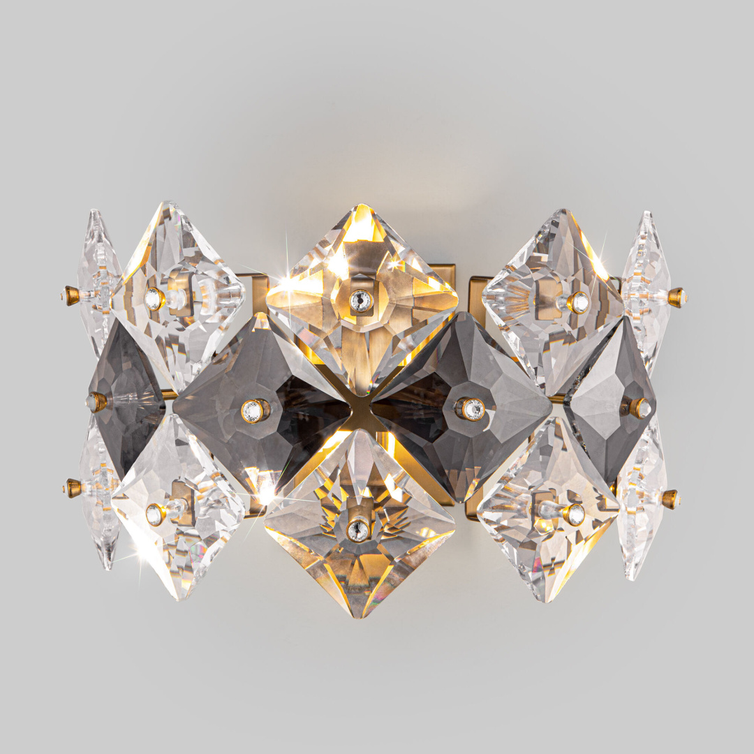 Rubis — элегантный светильник, наполняющий пространство роскошью. Изысканная арматура цвета латунь усеяна хрусталем Strotskis, который привносит атмосферу торжества и изысканности. Сочетание дымчатого и прозрачного хрусталя строгой геометрической формы добавляет акценты в интерьер. Лучи света, попадая на хрусталики, создают оригинальную игру света и бликов.