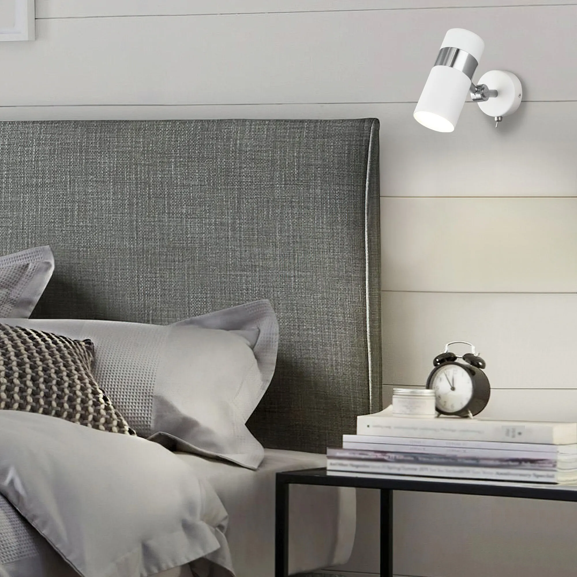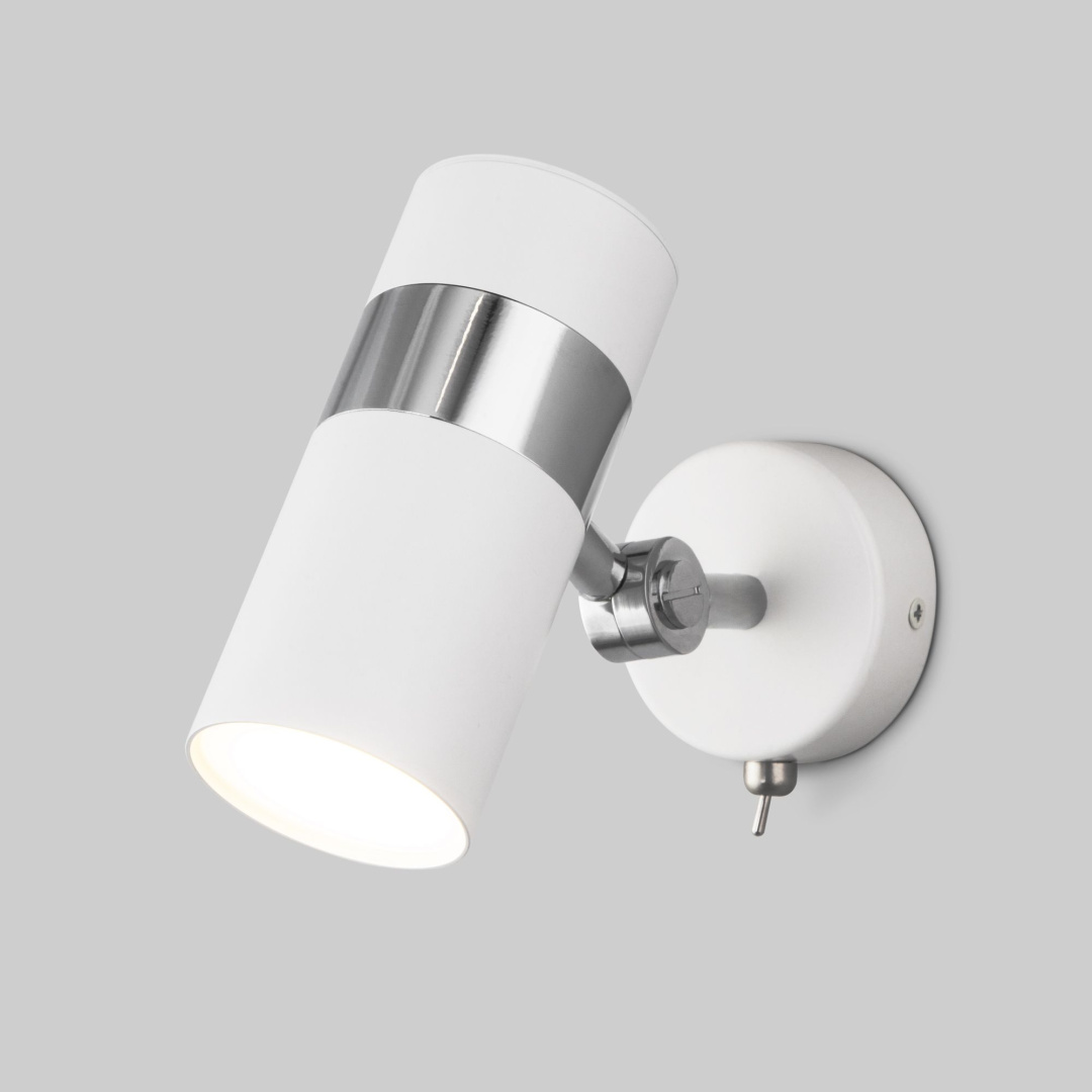 Настенный светильник с выключателем 20096/1 белый/ хром создаст качественное дополнительное освещение и станет ярким дополнением к основному источнику света. Благодаря поворотному металлическому плафону можно направлять световой поток в нужном направлении. В качестве источника света используются сменные лампы с цоколем GU10. Патрон рассчитан на максимальную мощность ламп накаливания 35 Вт.