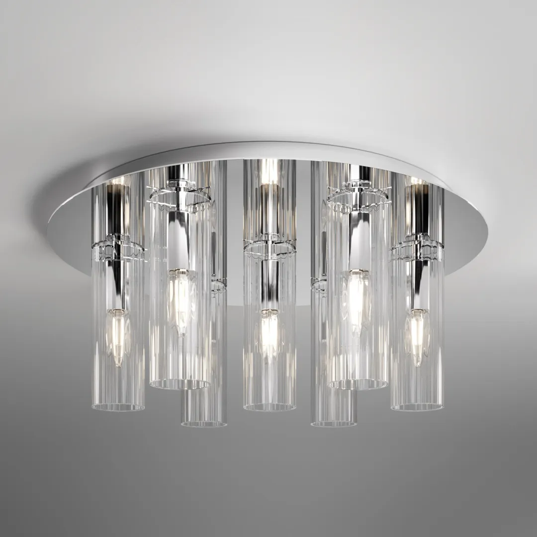 Потолочная люстра из коллекции Merge предназначена для создания основного освещения в доме. Хромированная потолочная чаша придаст помещению ощущение изысканности и утончённости, отражая световые блики, создающие эффект лёгкости и воздушности пространства. Плафоны из фактурного стекла обеспечат мягкий рассеянный свет, наполняющий комнату тёплыми оттенками.