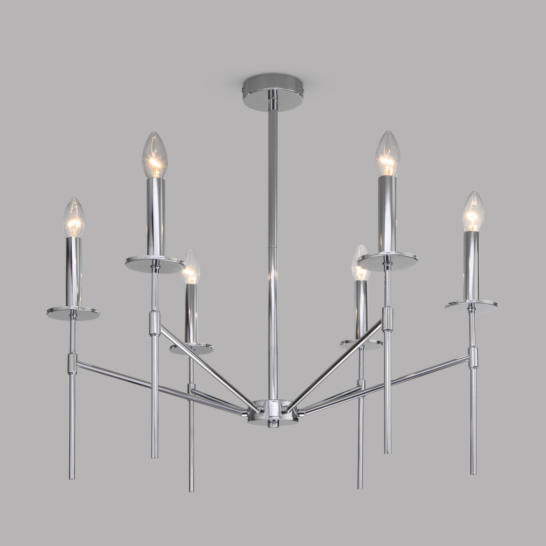 Люстра Anders в цвете хром- это острое сочетание трендовой геометрии и концепции традиционной люстры-канделябра. Шесть открытых источников света без привычных для нас стеклянных плафонов подчеркивают четкость линий модели и оригинальность задумки. В светильнике используются сменные лампы с цоколем E14. Благодаря гармоничному сочетанию классических и современных дизайн-приемов потолочный светильник Anders создаст запоминающийся визуальный образ в любом интерьере гостиной, спальни или кухни.