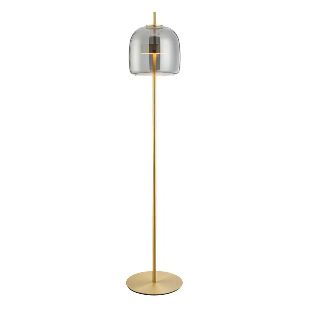 Торшер с каркасом цвета золото, плафон из дымчатосерого выдувного стекла со встроенным модулем LED.