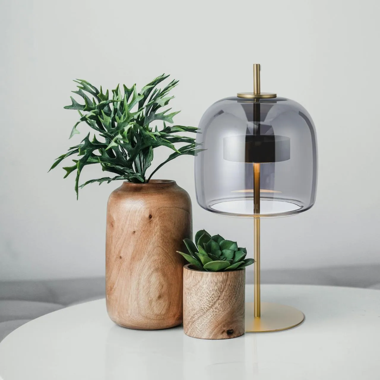 Торшер с каркасом в цвете золото, плафон из янтарного выдувного стекла со встроенным модулем LED.