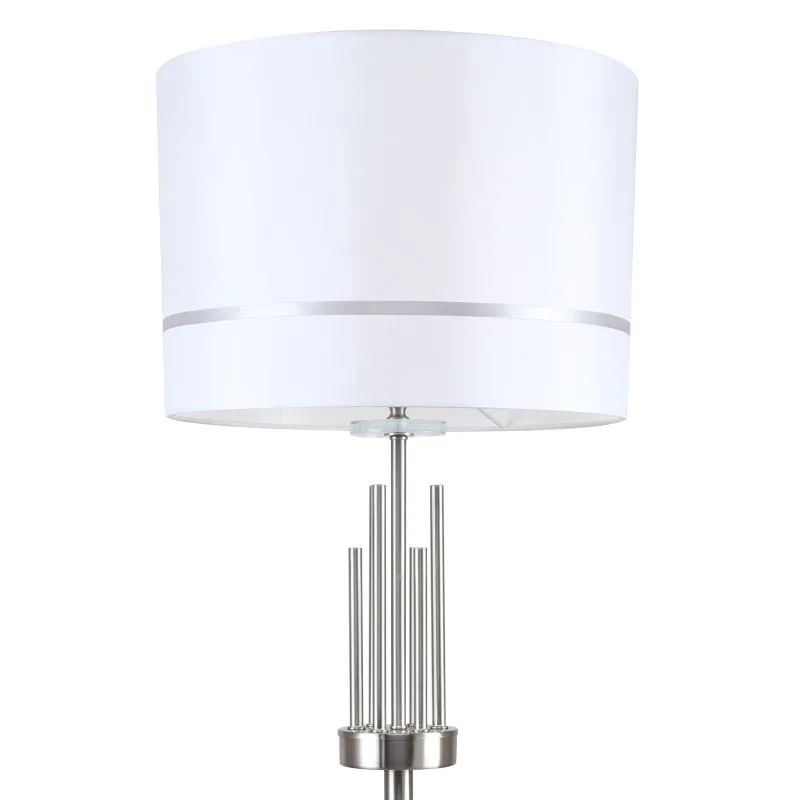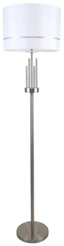 Торшер из коллекции Chart выполнен из металла, гальванизированного в цвет никеля, и декорирован железными стержнями в цвет арматуры. Текстильный абажур белого цвета с термостойким акрилом внутри отделан кантом в цвет арматуры. Декоративная розетка выполнена из прозрачного стекла.