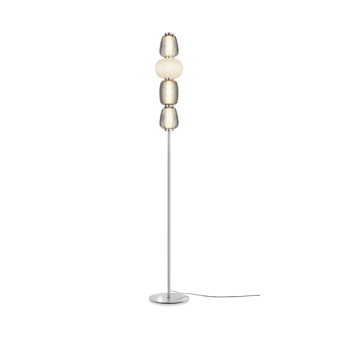 Металлическая арматура, цвет - золото, хром. Микс плафонов округлых и вытянутых форм из белого матового и прозрачного стекла с сетчатым и с линейным повторяющимся рельефным рисунком. Регулируемая высота подвесных моделей, провод - 3 метра. LED-источник света, цветовая температура 3000К.