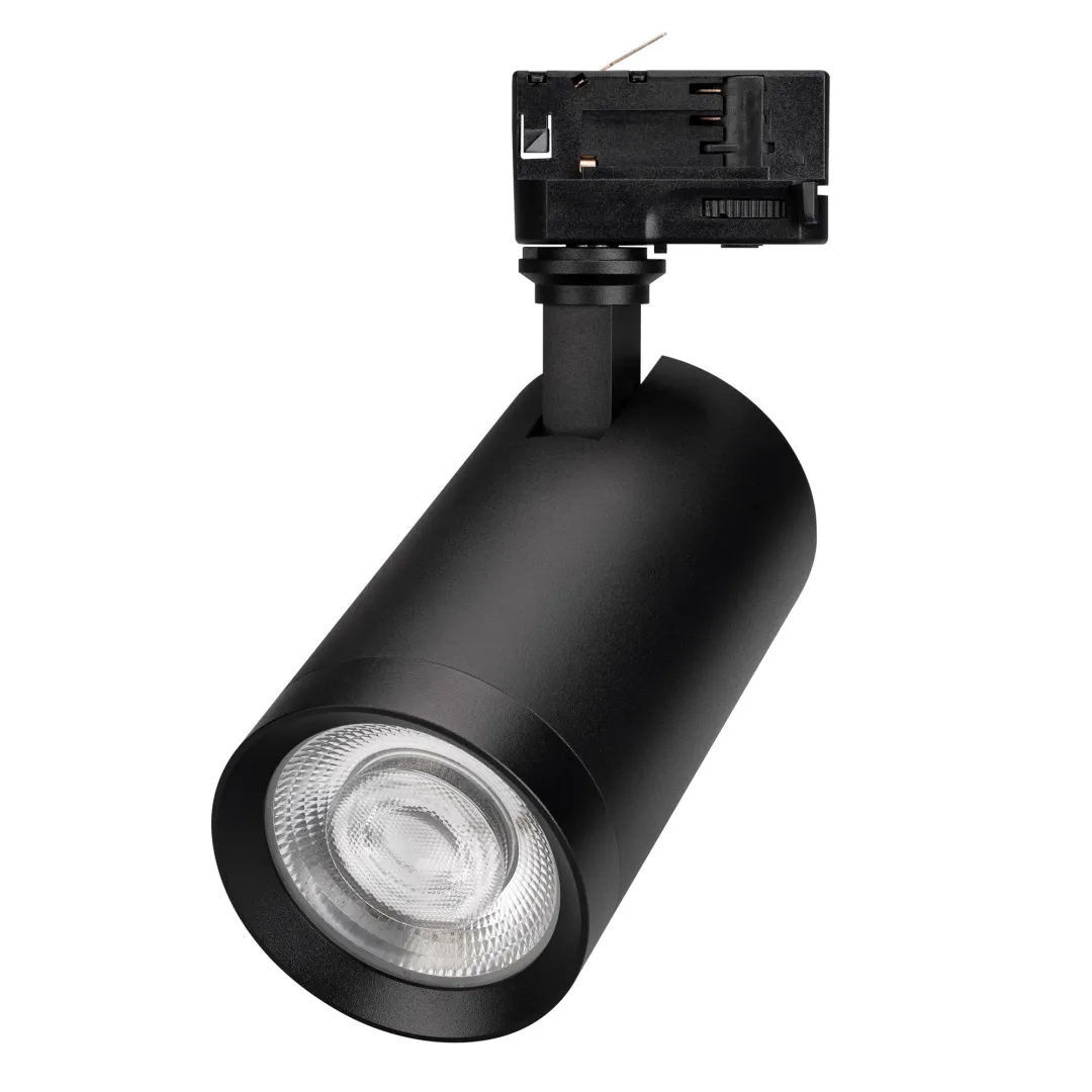 Светильник подвесной для треков/шин 4 провода, 20Вт. Цвет свечения меняется в диапазоне 2700К-4000К-6000К (при помощи переключателя на корпусе), световой поток 1540-2030 лм, 77-101 лм/Вт, угол 38°, CRI>95. Корпус круглый, алюминий, цвет черный, IP20. Размеры DxL Ø85x160 мм. Входное напряжение AC220-240V, мощность 20Вт. Драйвер встроенный 15-28 В, 700 мА. Диммирование по TRIAC.