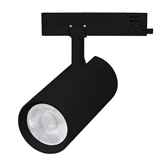 Светильник подвесной для треков/шин 4 провода. Мощность 30 Вт, св. поток без решетки honeycomb 3000 лм, 100 лм/Вт, с решеткой honeycomb 1980 лм, 66 лм/Вт, теплый 3000 K, CRI>90, угол 36°, напряжение питания 230 В. Черный круглый корпус из алюминия, материал линзы PMMA, степень защиты IP20. Размер: диаметр 90 мм, длина световой части 141 мм. Монтаж на трек 3-фазный. Драйвер встроенный 24-42 В, 750мА., пульсация <5%