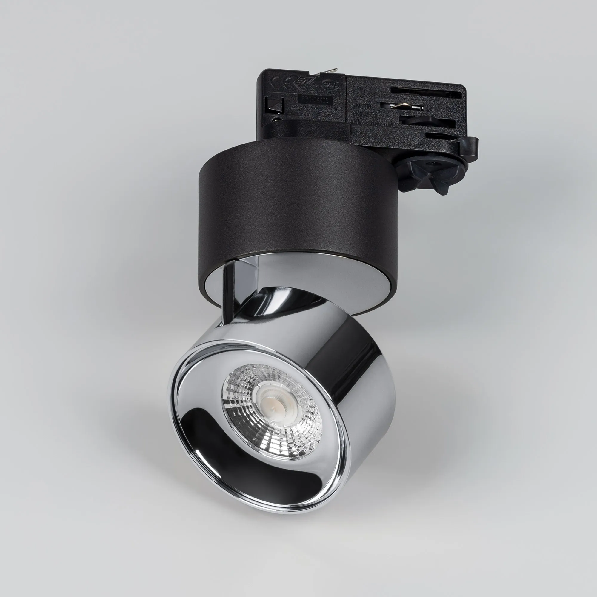 Светильник подвесной для треков/шин 4 провода. Мощность 9 Вт, св. поток 580 лм, 64 лм/Вт, дневной 4000 K, CRI>90, угол 36°, напряжение питания 230 В. Модуль цвета хром, черный круглый корпус из алюминия, степень защиты IP20. Размеры корпуса: длина адаптера 86 мм, ширина 32 мм, высота 38,2 мм., высота основания 46 мм. Размер светодиодного модуля: диаметр 77 мм, высота 59 мм. Монтаж на трек 3-фазный. Драйвер 38 В, 200 мА, пульсация <1%.