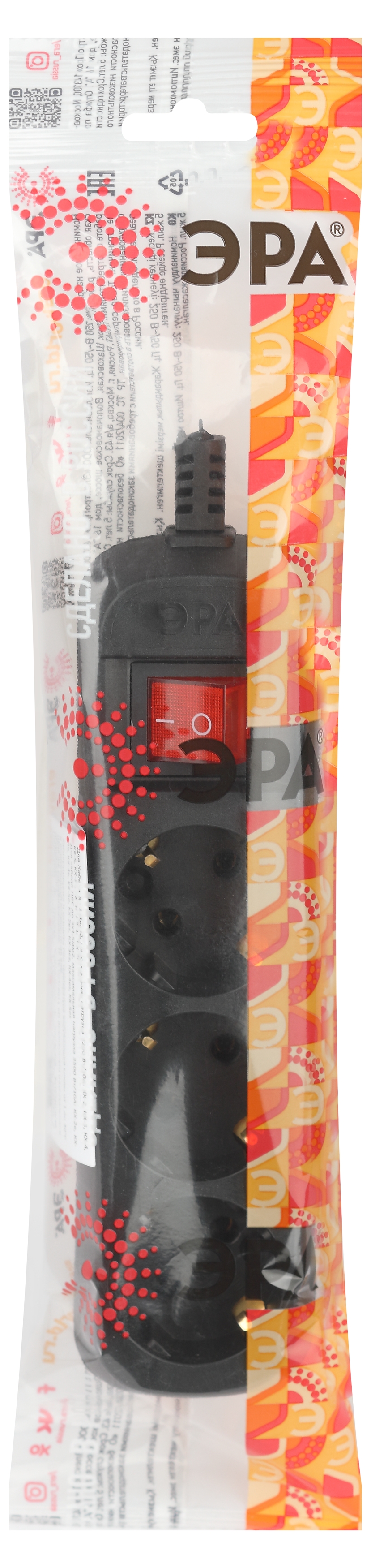Колодка ЭРА KX-3es-B на 3 розетки, с заземлением, с выключателем, черная. Максимальная мощность - 16 А/3500 Вт. Для кабеля до 3х1,5мм2
