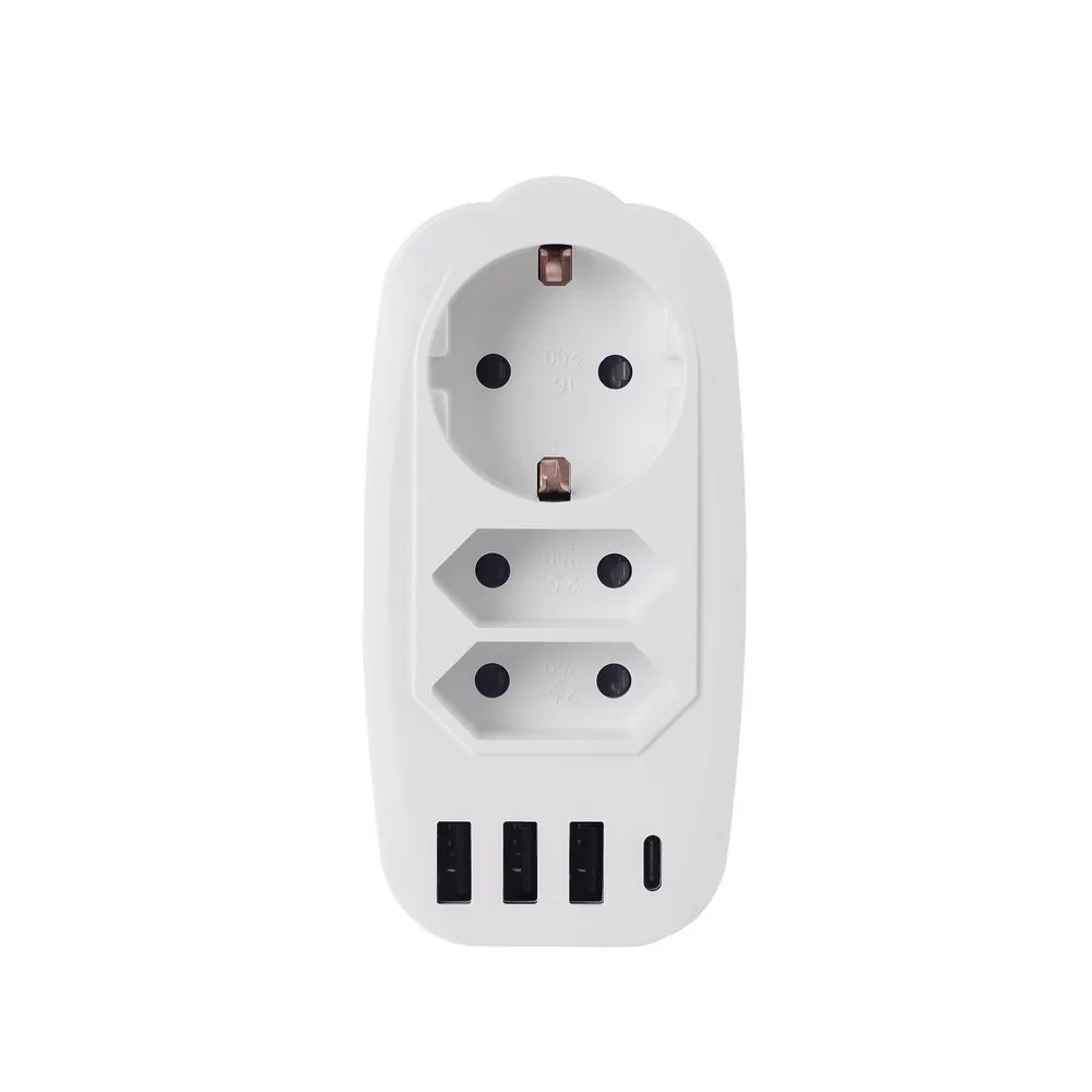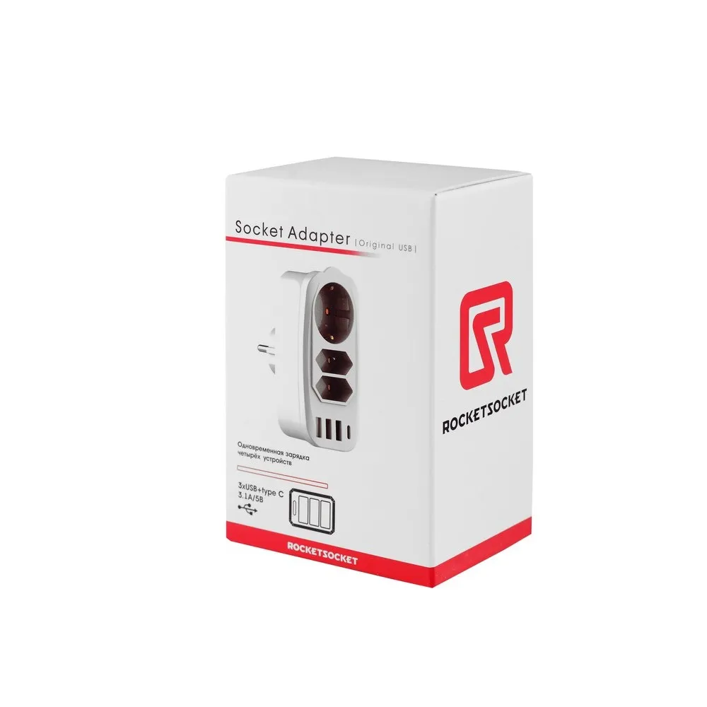 Разветвитель RocketSocket Socket Adapter 3 Euro 16A, 3 USB 3A+C с блоком 5В/3.1А, цвет белый-оснащен 3-я мощными портами USB (3 A) и 1 USB Type-C, что позволяет заряжать 4 устройства одновременно, в том числе планшетные компьютеры и смартфоны. Время зарядки будет меньше чем при использовании USB порта на вашем ноутбуке.