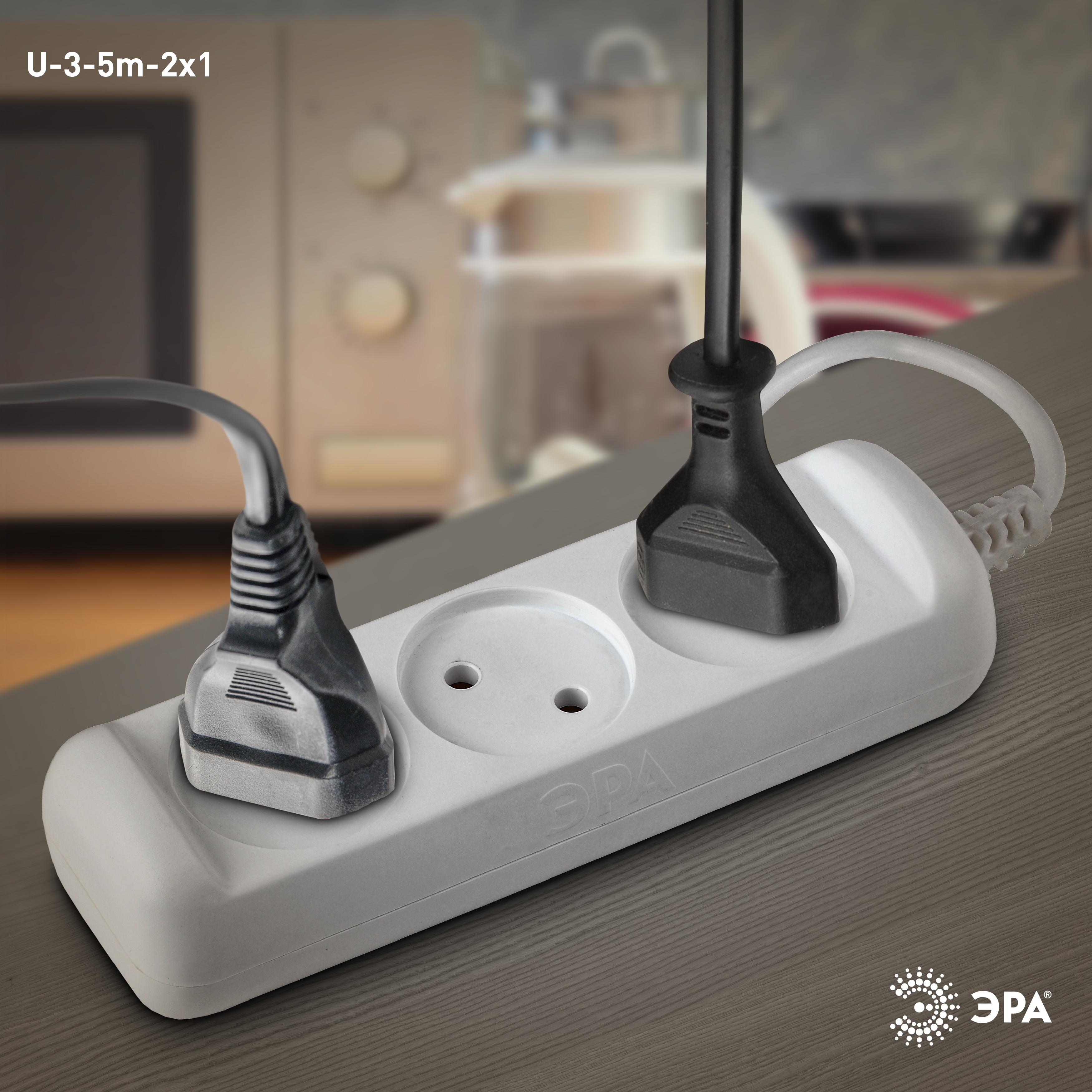 Удлинитель электрический Эра U-3-5m без заземления, ПВС, 2x1мм2, 2 розетки, 5м. Рассчитан на максимальную мощность 10А/2200 Вт. Удлинитель Эра станет Вашим надежным помощником, если Ваши любимые электроприборы находятся далеко от розеток. Провод в удлинителях Эра сделан из 100% меди, что делает его абсолютно пожаробезопасным. Корпус выполнен из ударопрочного и негорючего пластика (полипропилен). В моделях с заземлением у вилки есть кольцо для удобного извлечения из розетки. Модель удлинителя на 10А позволяет подключить мощные бытовые приборы общей нагрузкой до 2200Вт. Не бойтесь включить чайник, обогреватель, микроволновку или другие электроприборы. Толстый провод удлинителя Эра гарантирует полную безопасность. Дизайн удлинителя разработан в России командой Эра Style.