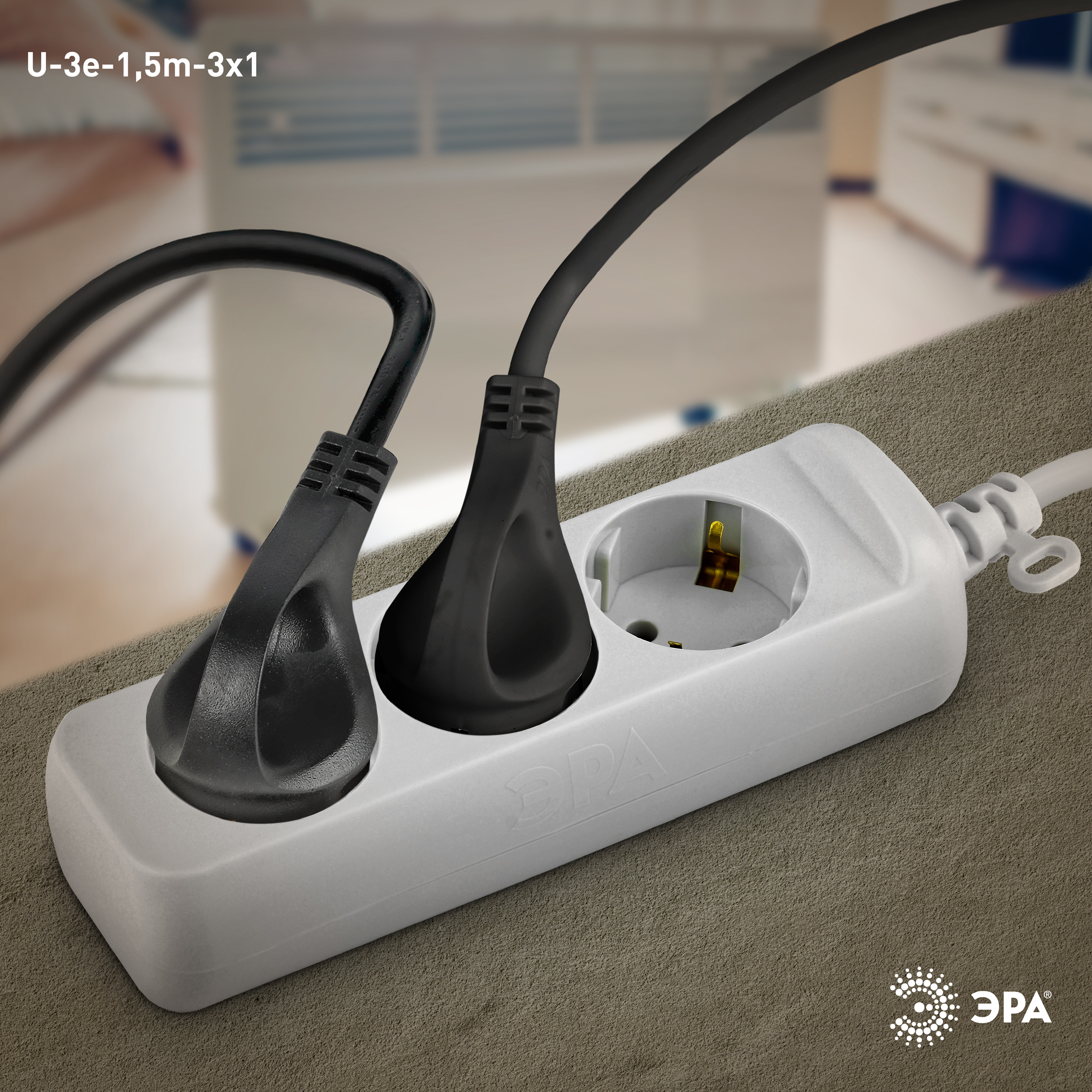 Удлинитель электрический Эра U-3e-1,5m с заземлением, ПВС, 3x1мм2, 3 розетки, 1,5м. Рассчитан на максимальную мощность 16А/3500 Вт. Удлинитель Эра станет Вашим надежным помощником, если Ваши любимые электроприборы находятся далеко от розеток. Провод в удлинителях Эра сделан из 100% меди, что делает его абсолютно пожаробезопасным. Корпус выполнен из ударопрочного и негорючего пластика (полипропилен). В моделях с заземлением у вилки есть кольцо для удобного извлечения из розетки. Модель удлинителя на 16А позволяет подключить мощные бытовые приборы общей нагрузкой до 3500Вт. Не бойтесь включить чайник, обогреватель, микроволновку или другие электроприборы. Толстый провод удлинителя Эра гарантирует полную безопасность. Дизайн удлинителя разработан в России командой Эра Style.