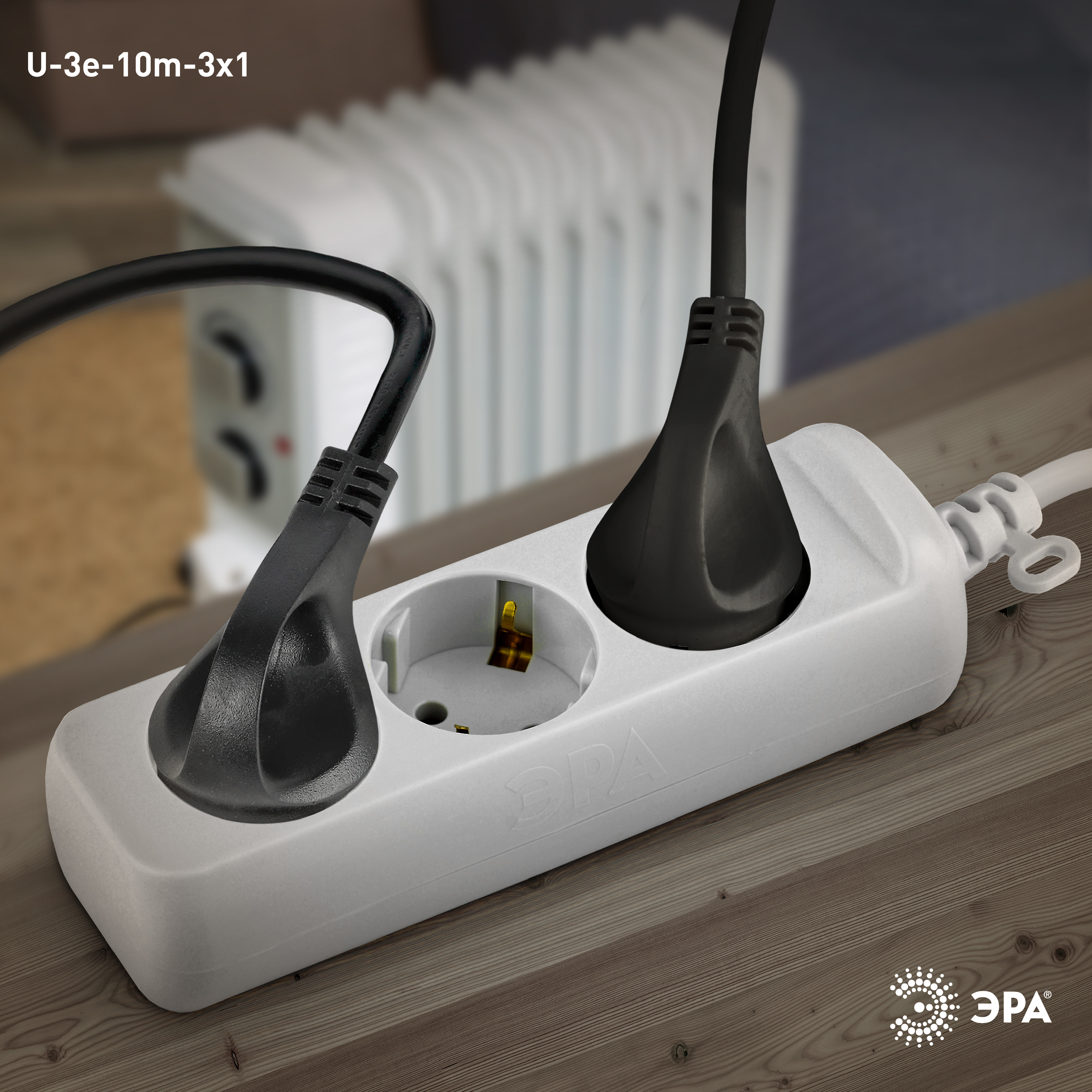 Удлинитель электрический Эра U-3e-10m-3x1 с заземлением, ПВС, 3x1мм2, 3 розетки, 10м. Рассчитан на максимальную мощность 16А/3500 Вт. Удлинитель Эра станет Вашим надежным помощником, если Ваши любимые электроприборы находятся далеко от розеток. Провод в удлинителях Эра сделан из 100% меди, что делает его абсолютно пожаробезопасным. Корпус выполнен из ударопрочного и негорючего пластика (полипропилен). В моделях с заземлением у вилки есть кольцо для удобного извлечения из розетки. Модель удлинителя на 16А позволяет подключить мощные бытовые приборы общей нагрузкой до 3500Вт. Не бойтесь включить чайник, обогреватель, микроволновку или другие электроприборы. Толстый провод удлинителя Эра гарантирует полную безопасность. Дизайн удлинителя разработан в России командой Эра Style.