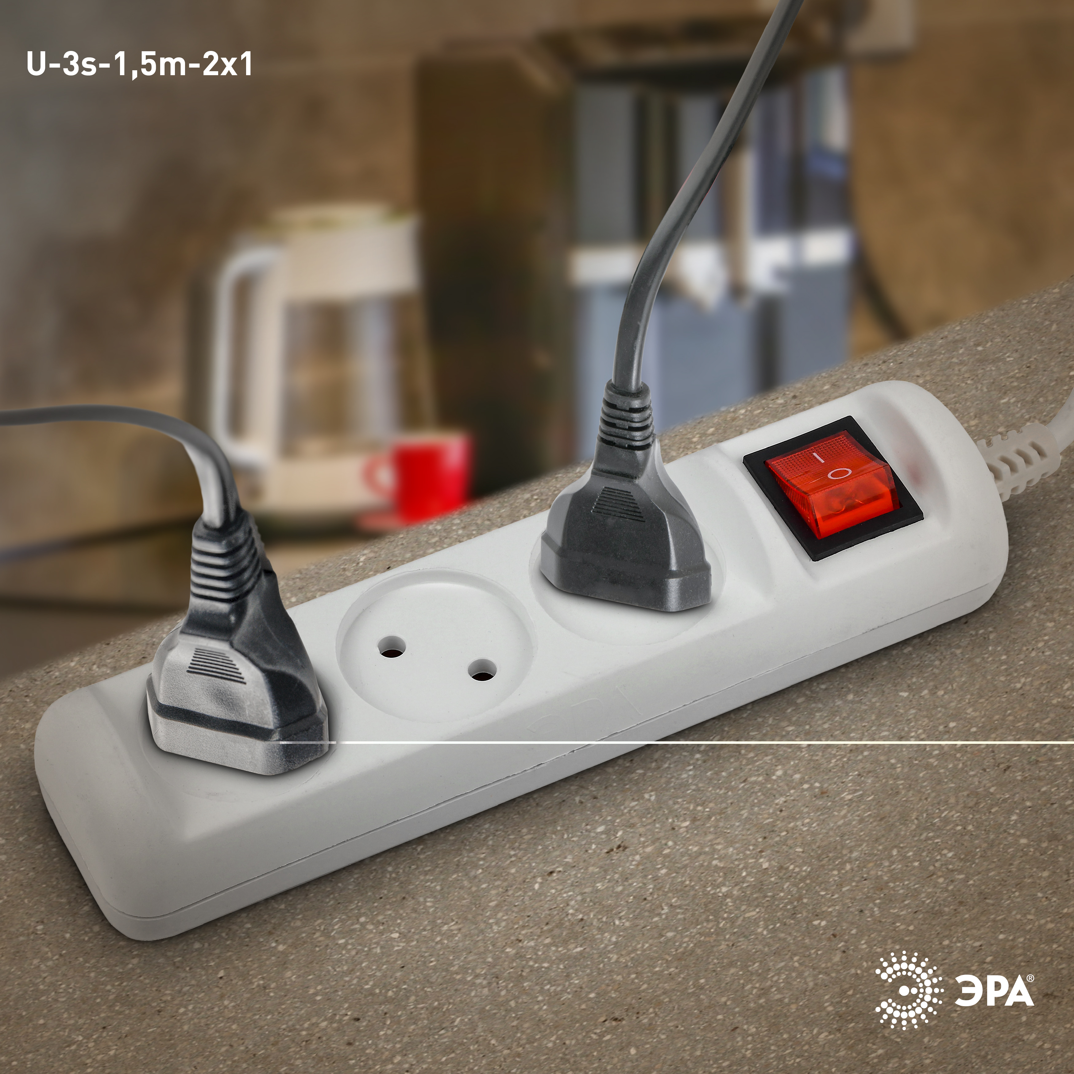 Удлинитель электрический Эра U-3s-1,5m-2x1 без заземления, с выключателем, ПВС, 2x1мм2, 3 розетки, 1,5м. Рассчитан на максимальную мощность 10А/2200 Вт. Удлинитель Эра станет Вашим надежным помощником, если Ваши любимые электроприборы находятся далеко от розеток. Провод в удлинителях Эра сделан из 100% меди, что делает его абсолютно пожаробезопасным. Корпус выполнен из ударопрочного и негорючего пластика (полипропилен). Модель удлинителя на 10А позволяет подключить бытовые приборы общей нагрузкой до 2200Вт. Дизайн удлинителя разработан в России командой Эра Style.