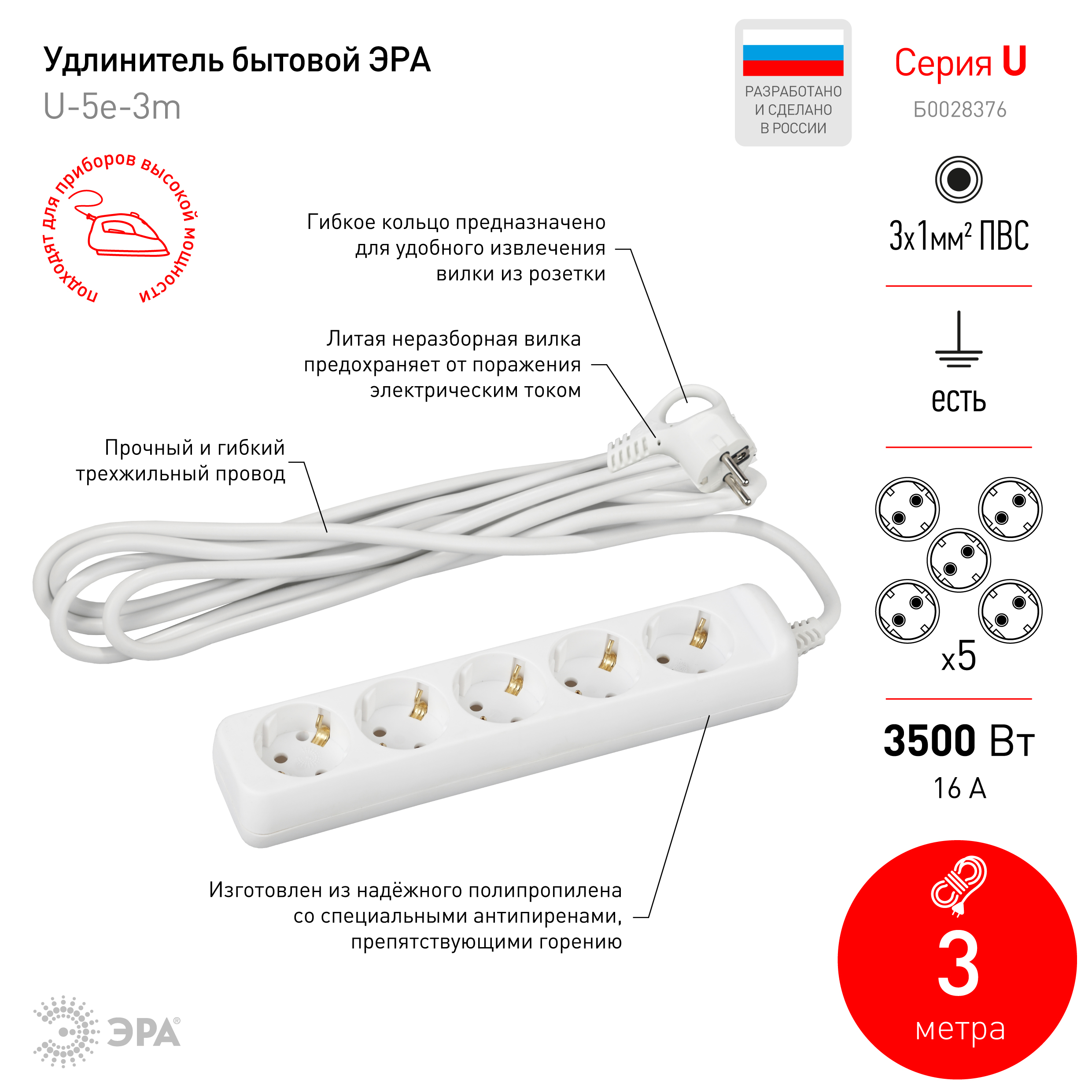 Удлинитель электрический Эра U-5e-3m-3x1 с заземлением, ПВС, 3x1мм2, 5 розеток, 3 м. Рассчитан на максимальную мощность 16А/3500 Вт. Удлинитель Эра станет Вашим надежным помощником, если Ваши любимые электроприборы находятся далеко от розеток. Провод в удлинителях Эра сделан из 100% меди, что делает его абсолютно пожаробезопасным. Корпус выполнен из ударопрочного и негорючего пластика (полипропилен). В моделях с заземлением у вилки есть кольцо для удобного извлечения из розетки. Модель удлинителя на 16А позволяет подключить мощные бытовые приборы общей нагрузкой до 3500Вт. Не бойтесь включить чайник, обогреватель, микроволновку или другие электроприборы. Толстый провод удлинителя Эра гарантирует полную безопасность. Дизайн удлинителя разработан в России командой Эра Style.